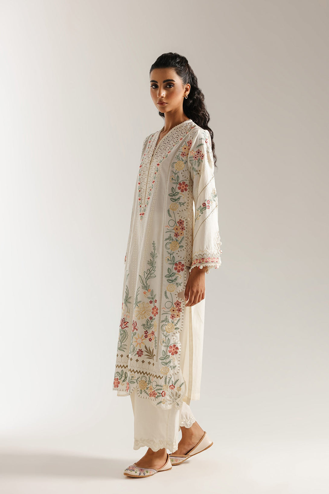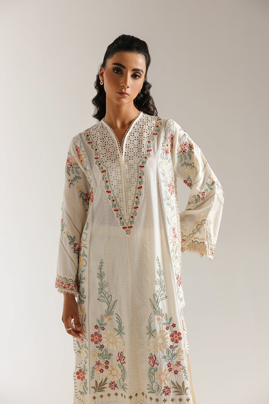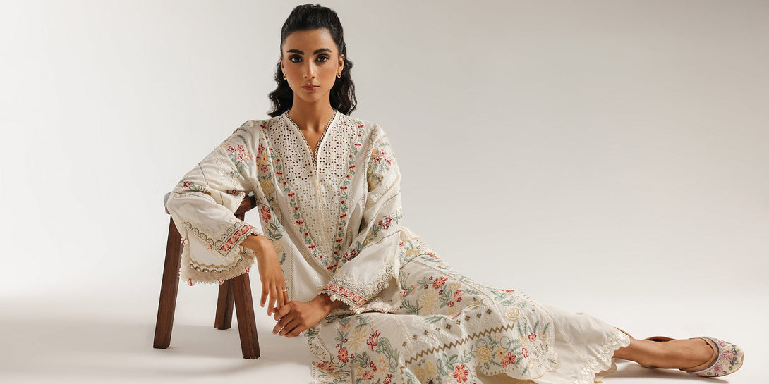This elegant suit features a pristine white tunic adorned with vibrant and intricate embroidery. The front of the tunic is beautifully decorated with floral motifs in shades of red, pink, green, and gold, creating a stunning and colorful design. The neckline is a standout feature, with delicate eyelet cut-work and embroidered details. The suit is completed with a matching, wide-legged trouser, offering a comfortable and graceful silhouette. This beautiful ensemble is a perfect blend of timeless craftsmanship and sophisticated style.