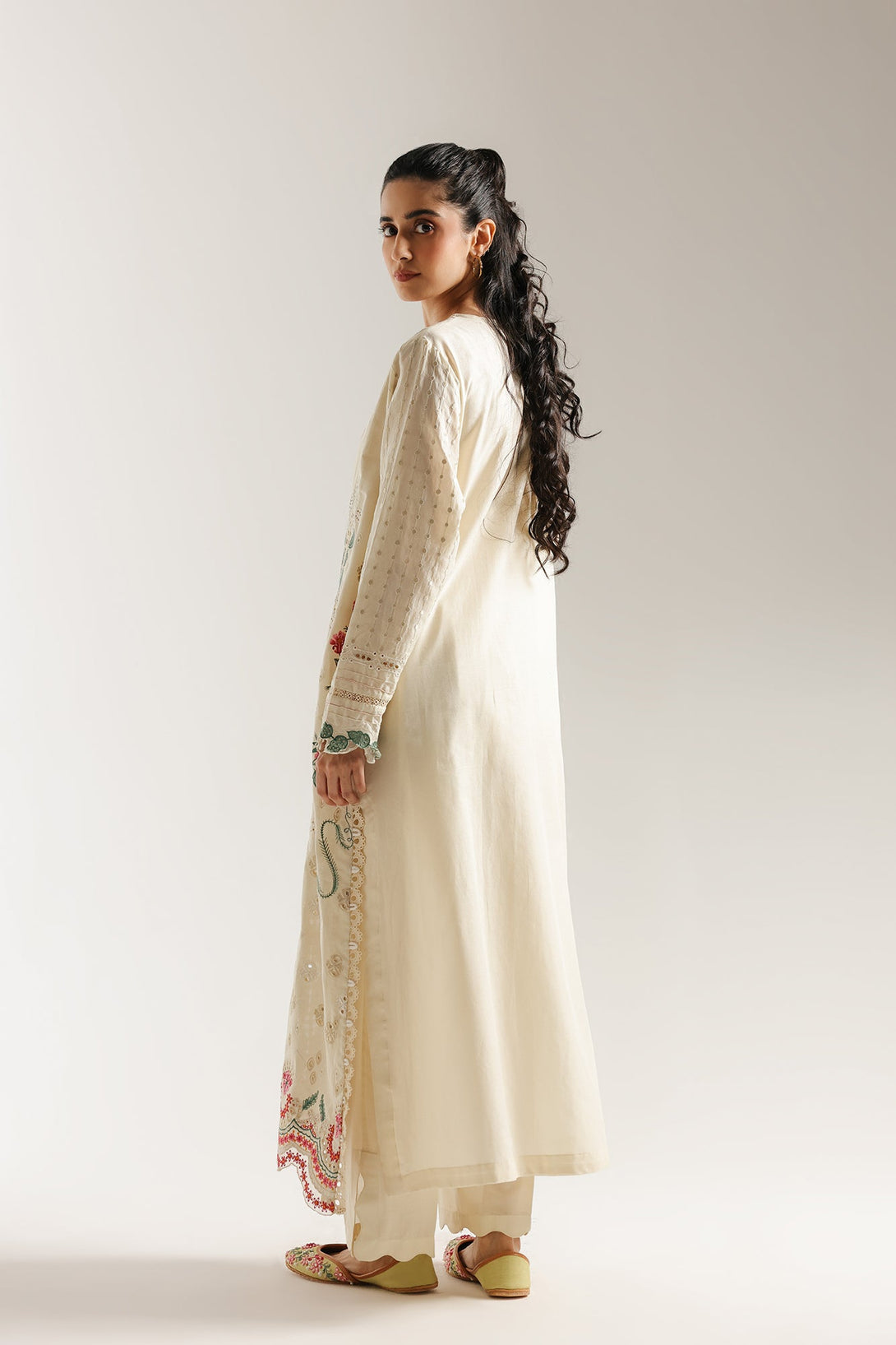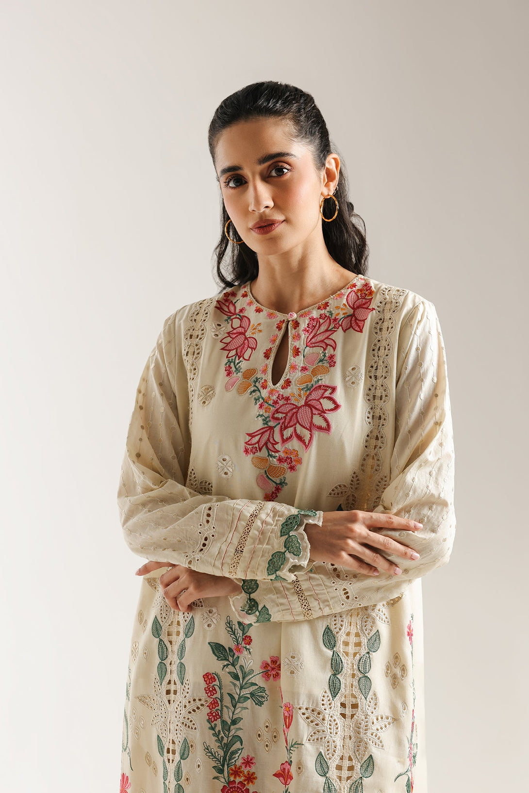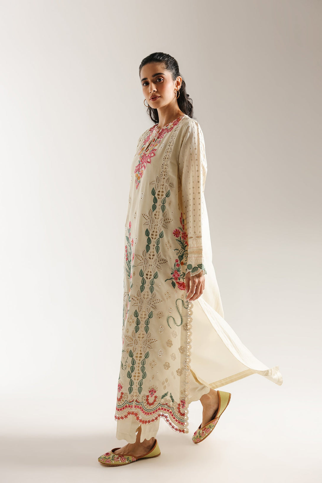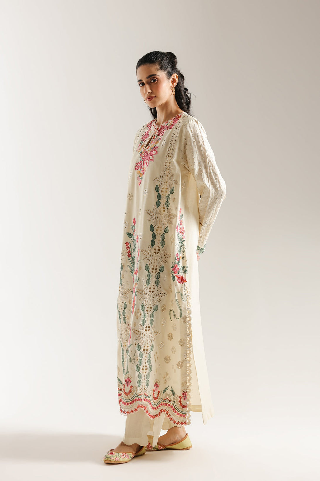 Discover a masterpiece of artisanal style with this exquisitely detailed embroidered shirt. This beautiful, long shirt is crafted in a graceful cream hue and features a stunning display of intricate floral and vine embroidery in soft pinks, rich greens, and vibrant reds. The design is elevated by delicate cutwork on the sleeves and a refined scalloped hem. This shirt is a truly elegant and captivating piece that will make a timeless addition to your wardrobe. Paired with matching straight fit trouser