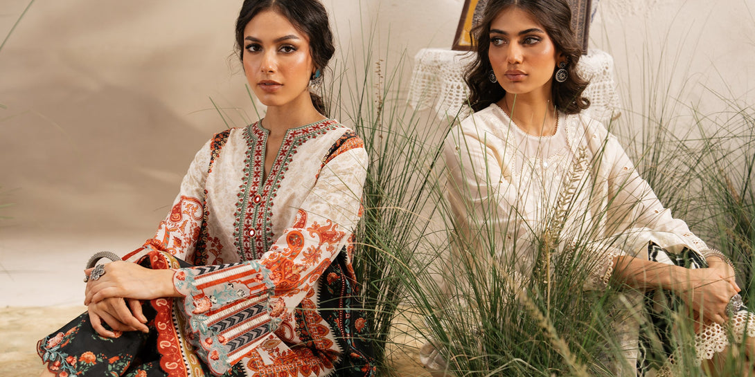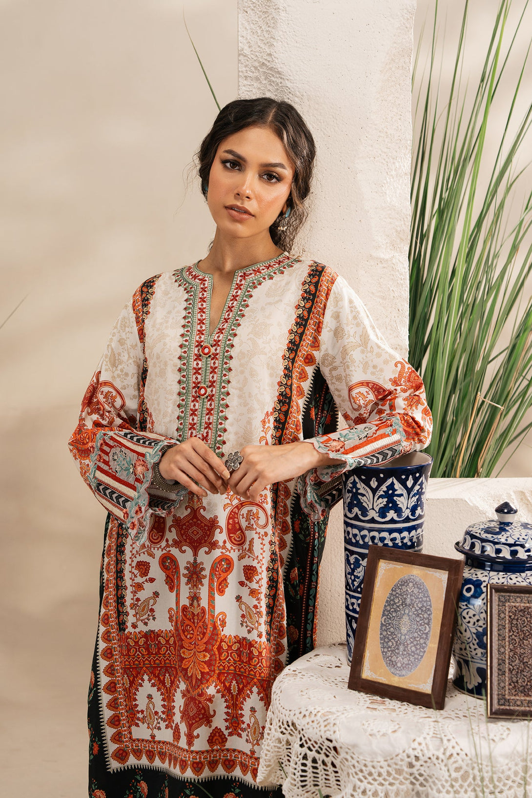 Step into a world of artistic grandeur with this stunning embroidered suit. The light, off-white fabric is a masterpiece of mixed prints, featuring a vibrant, large-scale floral and paisley design in shades of orange, green, and red. The striking black and white geometric borders on the hem and sleeves add a modern and sophisticated touch. Paired with complementing black trousers that feature a playful floral print, this ensemble is a celebration of bold design and refined elegance.