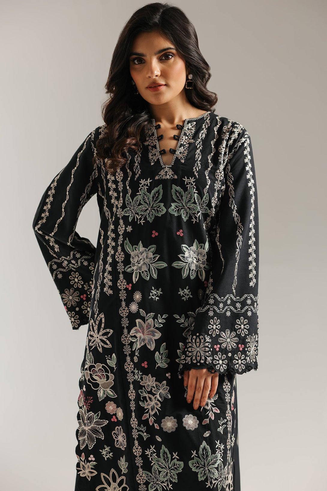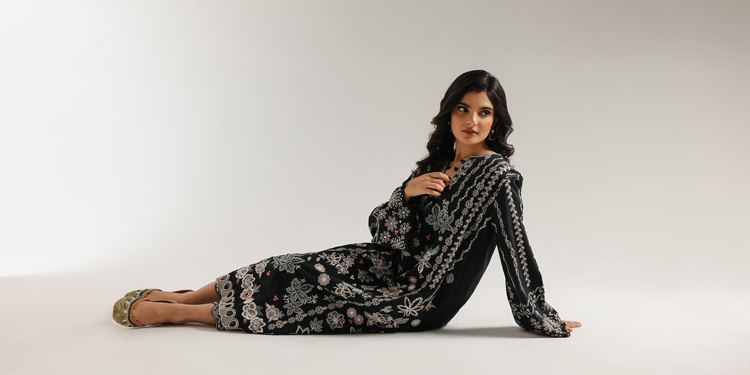 This stunning embroidered suit is a beautiful display of intricate artistry. The deep black kurta is richly adorned with vibrant floral embroidery in a graceful palette of white, pink, and green. With its beautifully detailed sleeves and a perfectly coordinated trouser, this ensemble creates a captivating and timeless look.
