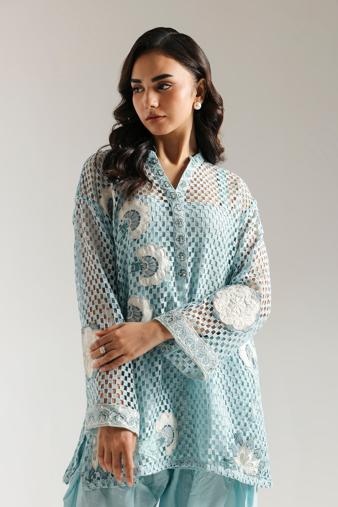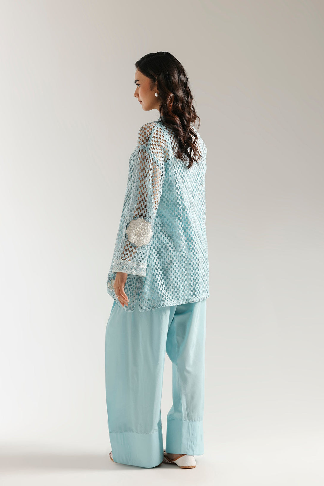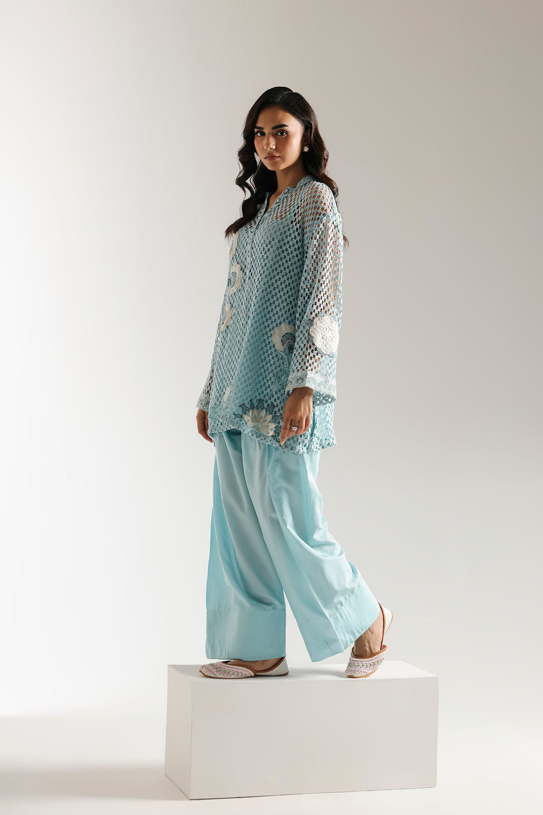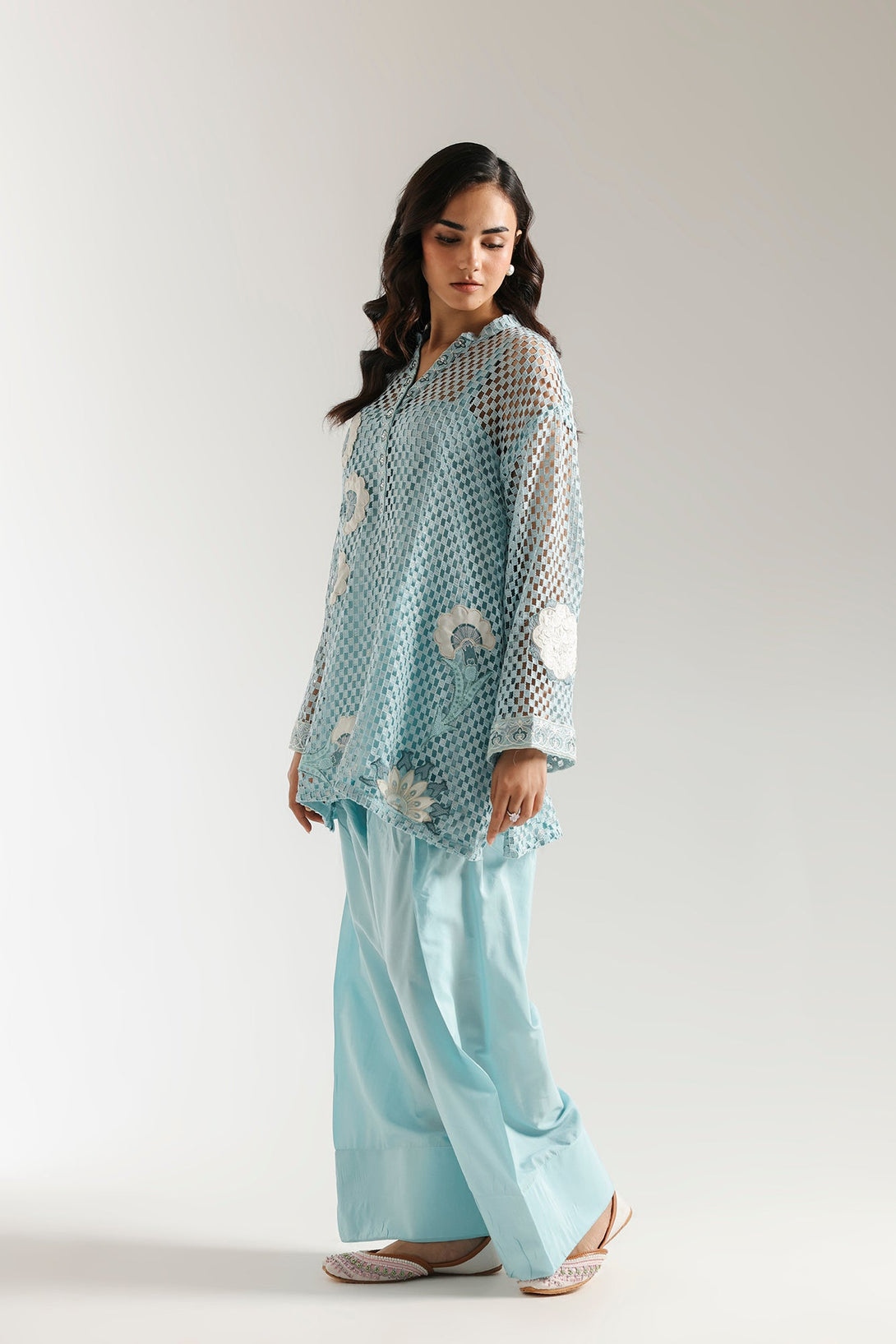 This elegant embroidered suit is a masterpiece of texture and style. The light blue crocheted shirt features intricate white floral embroidery, perfectly complemented by a smooth inner slip for comfort and coverage. The ensemble is completed with a coordinating farshi shalwar that drapes beautifully, making this a unique and sophisticated choice for any special event.