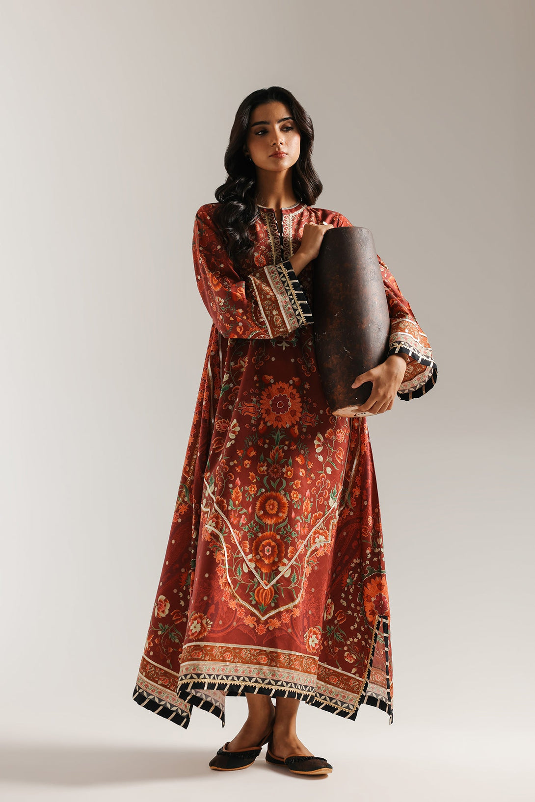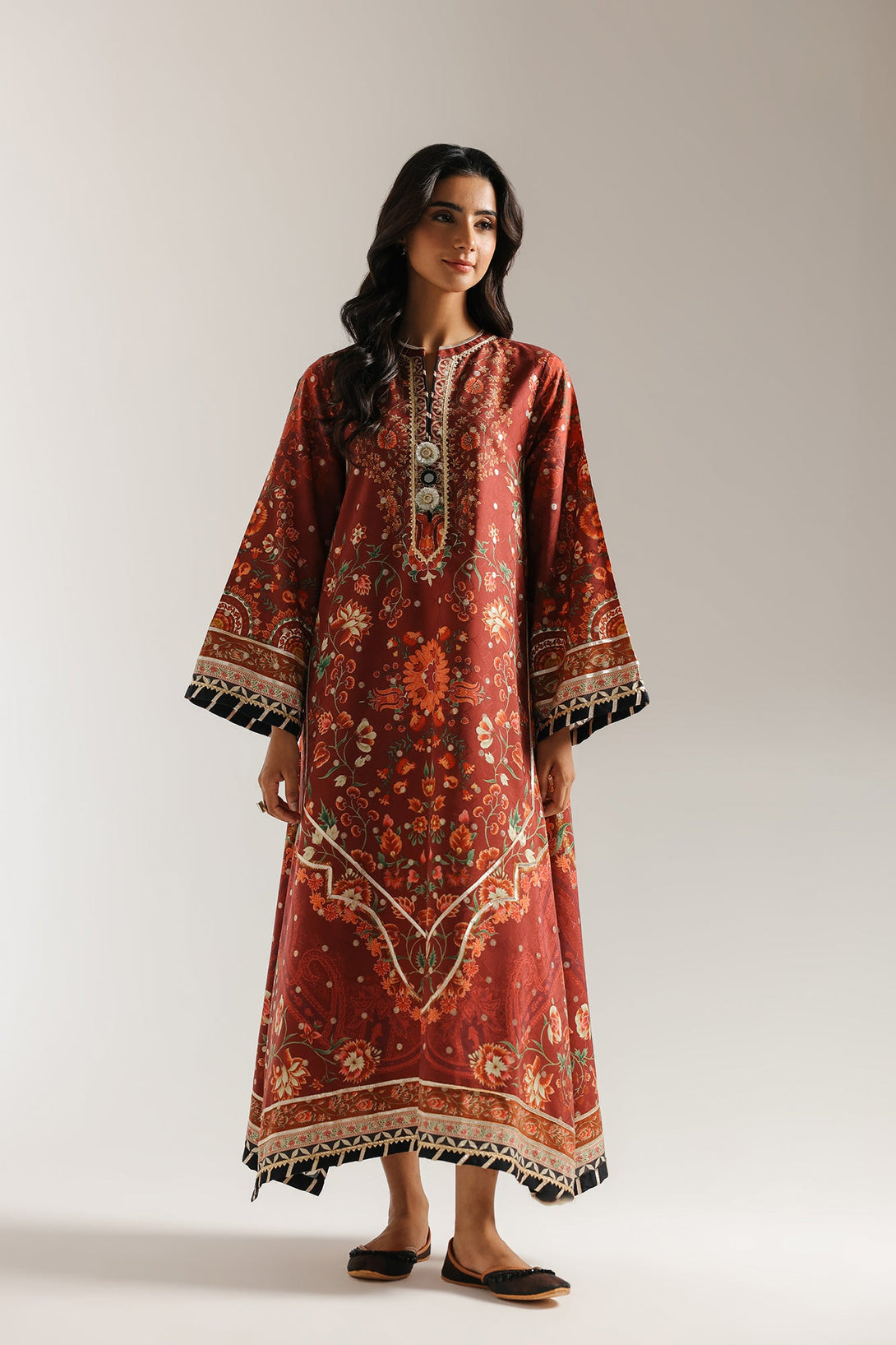 Make a powerful statement in this stunning printed shirt. This long shirt is a masterpiece of intricate design. The rich red base of the long shirt serves as a graceful canvas for the elaborate floral and paisley print. Crafted from a luxurious jacquard with subtle zari work, this shirt has a classic A-line silhouette with a flowing fit. The shirt is perfect for making a sophisticated statement at any event.