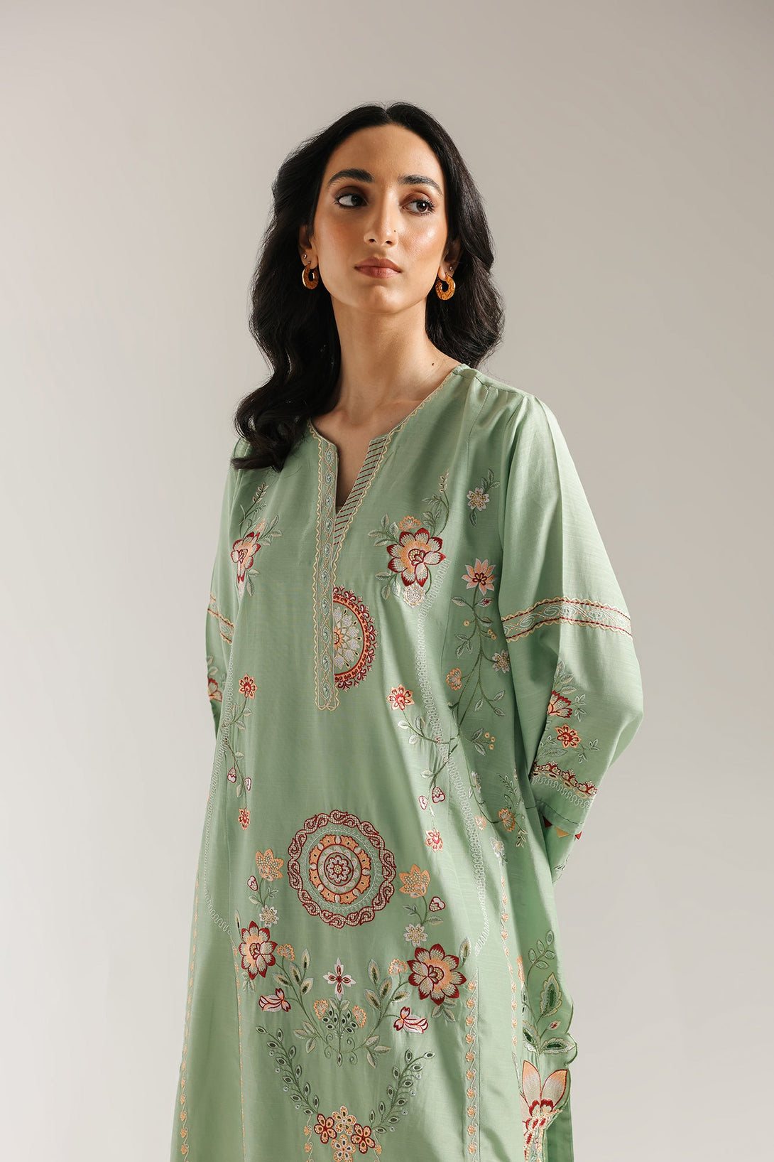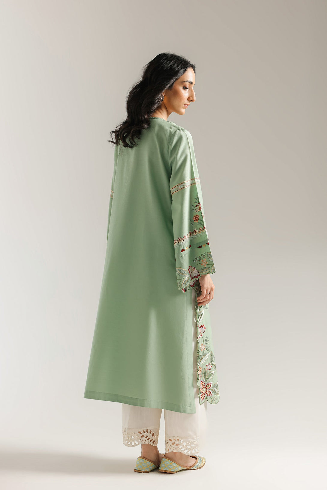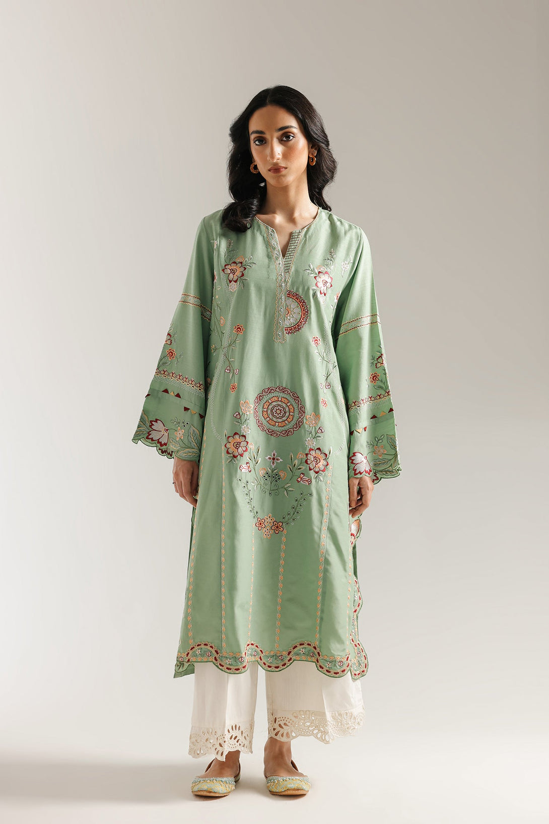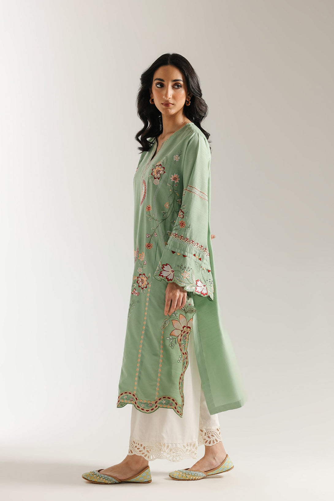 Step out in style with this calming sage green shirt, beautifully adorned with intricate floral embroidery in a delicate palette of coral, gold, and red. The striking wide, bell-shaped sleeves are finished with a graceful scalloped border, which is perfectly mirrored on the hem of the crisp white culotte trousers. A true blend of artistry and comfort, this suit offers a sophisticated and fresh look for any occasion.