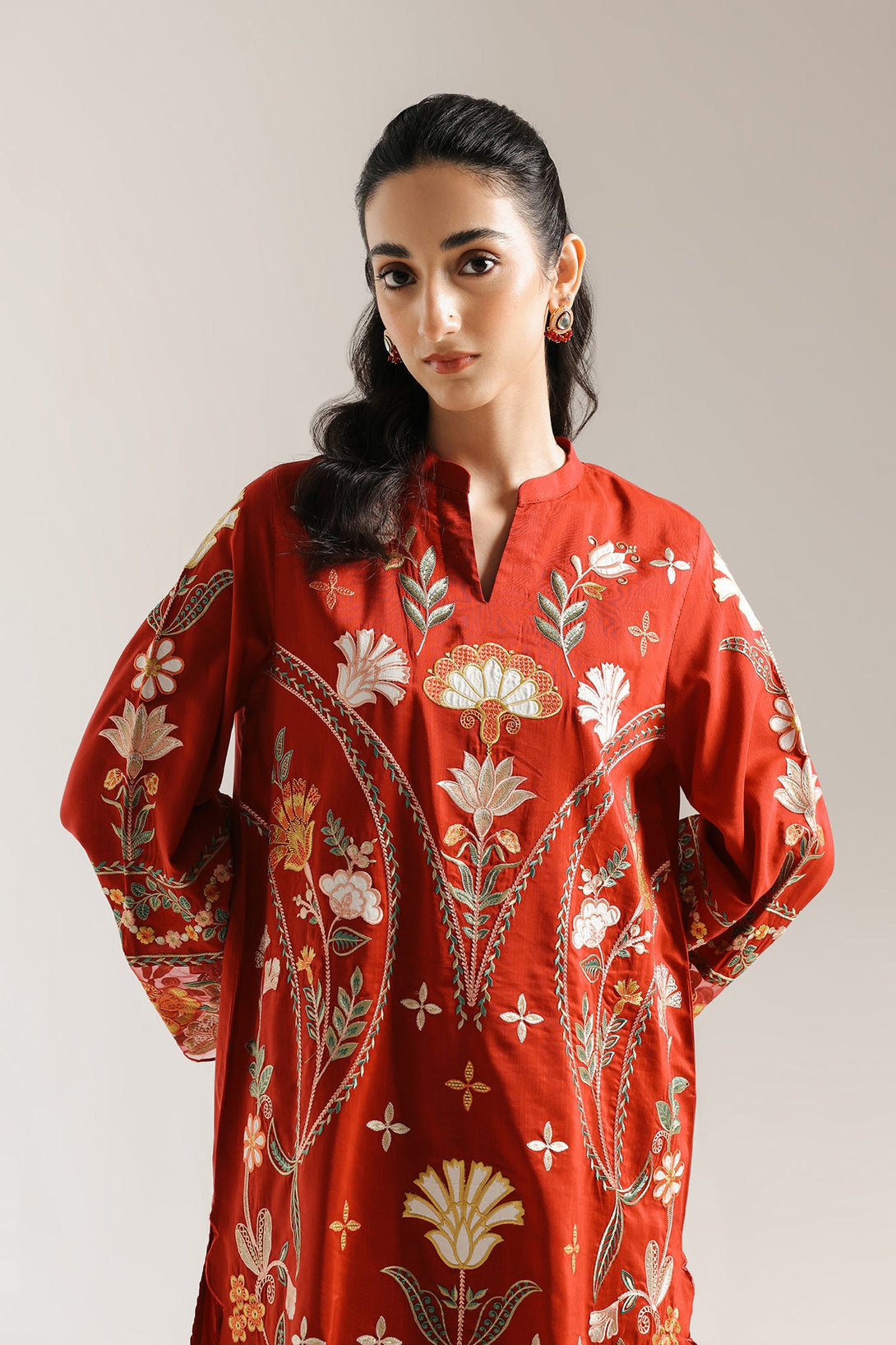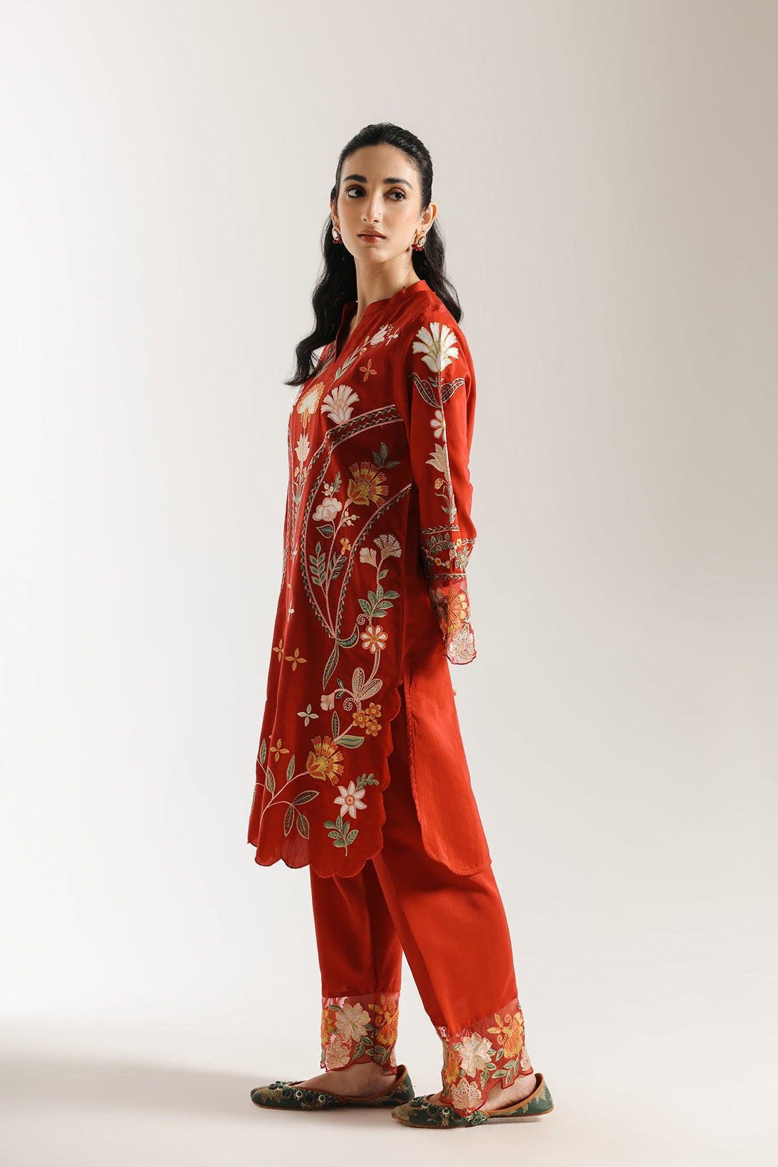 This exquisite suit is a beautiful showcase of masterful embroidery and a rich, bold color. The tunic, in a stunning shade of rust red, is a work of art, with intricate floral and botanical motifs embroidered in ivory, gold, and green. The detailed patterns cascade down the front and across the wide, flared sleeves, creating a captivating design. The tunic's hem is finished with a graceful scalloped edge. The suit is completed with a matching shalwar that feature a broad, embroidered border at the bottom, creating a truly luxurious and cohesive look. This elegant ensemble is a perfect choice for a grand celebration or a festive occasion.