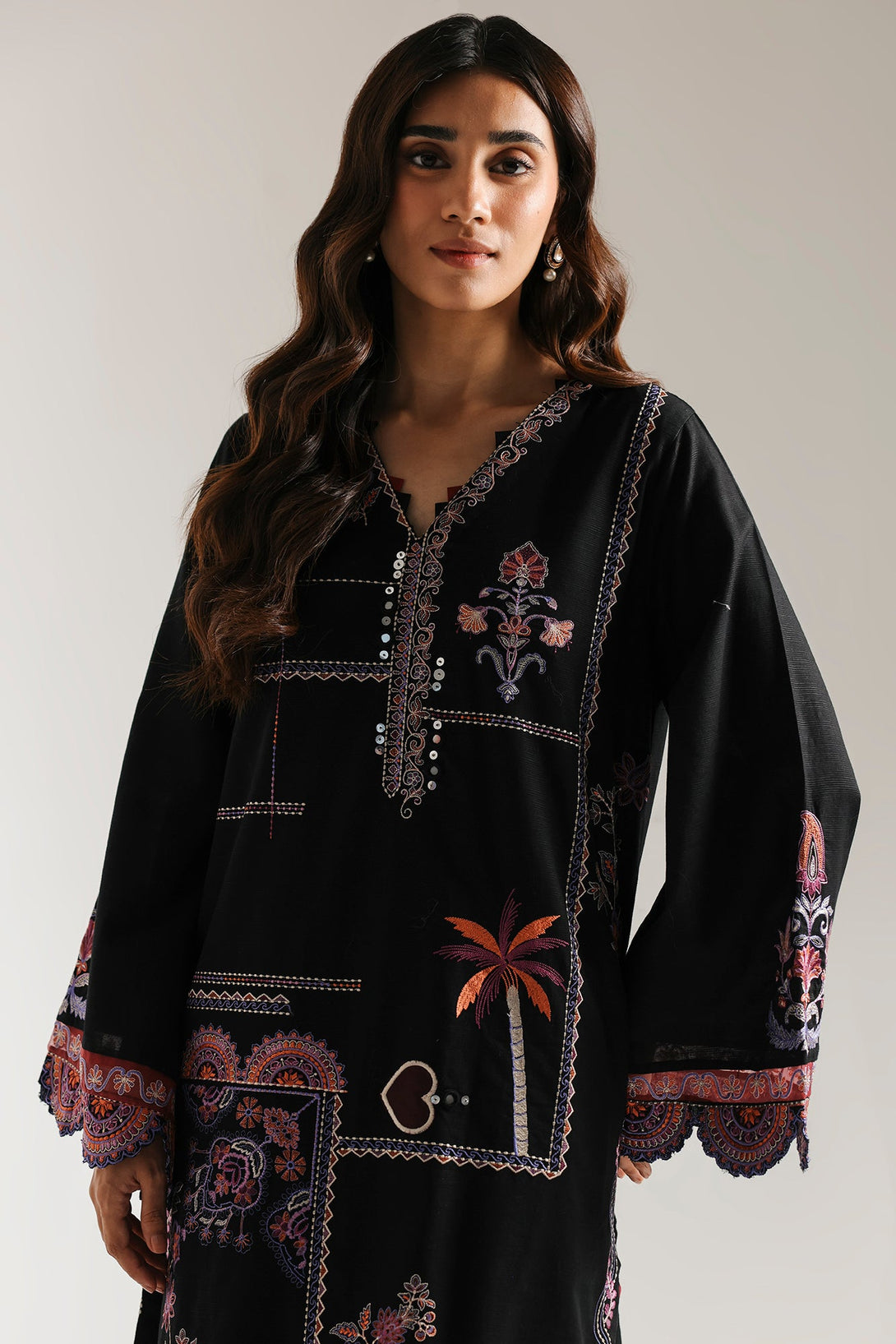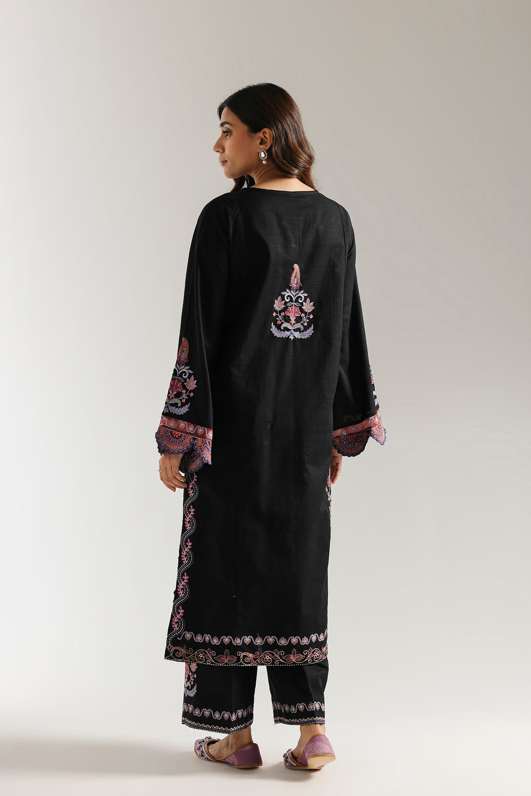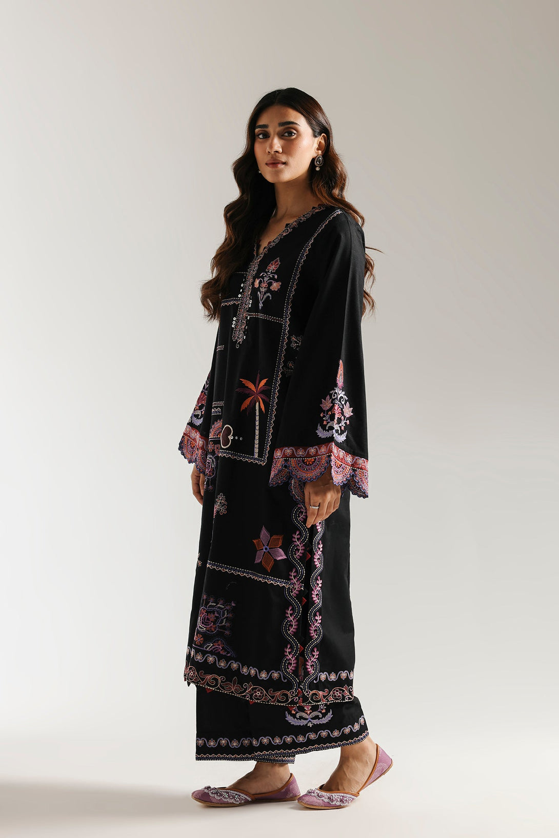 This artistic embroidered suit is a bold statement of style. The deep black kurta is a canvas for intricate, multi-colored embroidery, featuring a captivating embroidery of abstract, geometric, and floral motifs. With its elegant wide sleeves and a perfectly coordinated trouser, this ensemble beautifully blends traditional craftsmanship with a modern, sophisticated design.