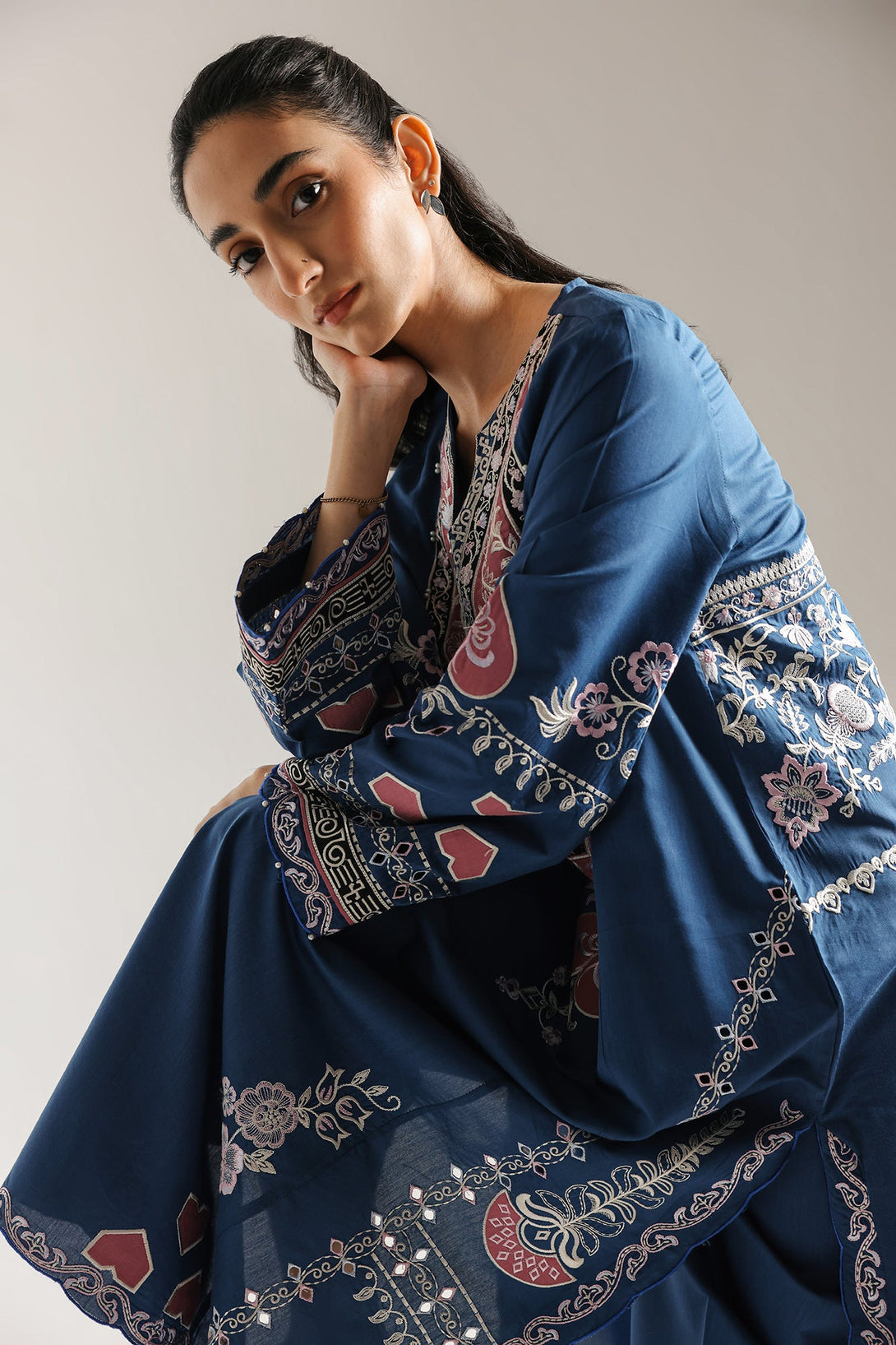 Wrap yourself in the rich hues of a sunset with this stunning embroidered suit. This two-piece ensemble is a true masterpiece of intricate design. The rich blue fabric of the long shirt serves as a dramatic backdrop for the beautiful floral and geometric embroidery in a captivating palette of pink, white, and red. The detailed threadwork and subtle bead embellishments on the neckline, front, and sleeves create a look of opulent elegance. The suit is completed with matching trouser, making it an ideal choice for any festive event or formal gathering.