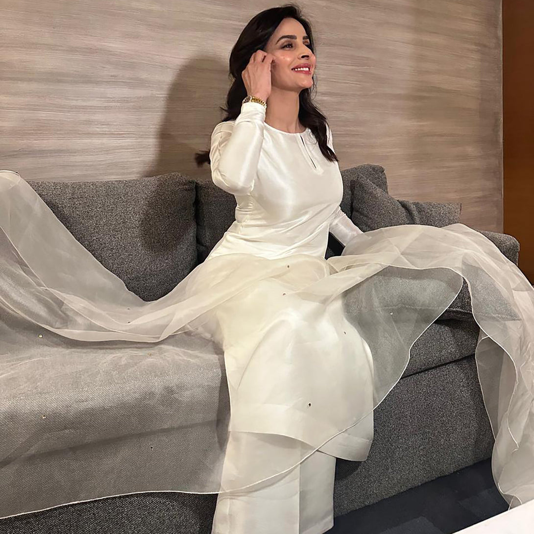 A clean white silk outfit designed with a subtle keyhole neckline, adding just the right amount of shape to the otherwise minimal look. The shirt has a straight, relaxed cut with plain full-length sleeves and is paired with straight pants for a balanced silhouette. The organza dupatta falls softly over both shoulders, complementing the polished shine of the fabric.