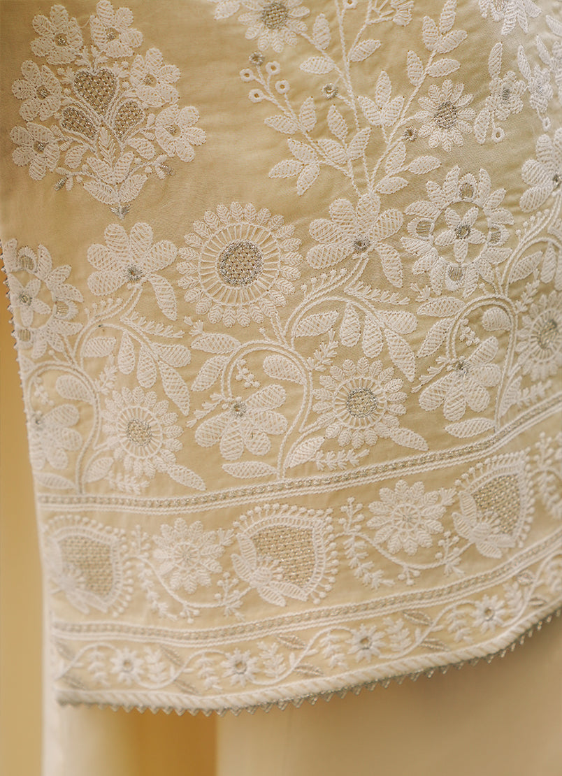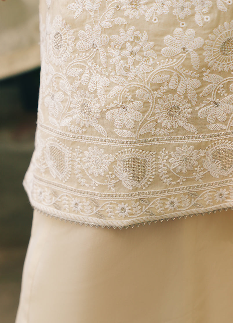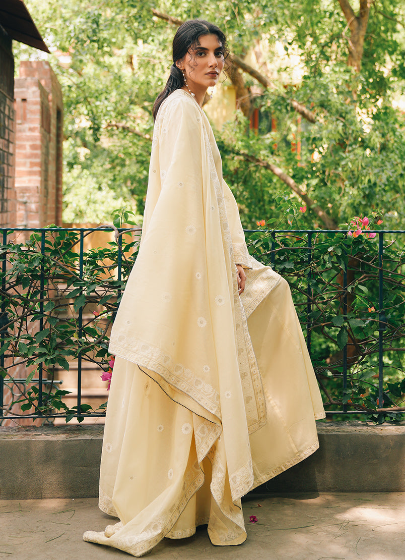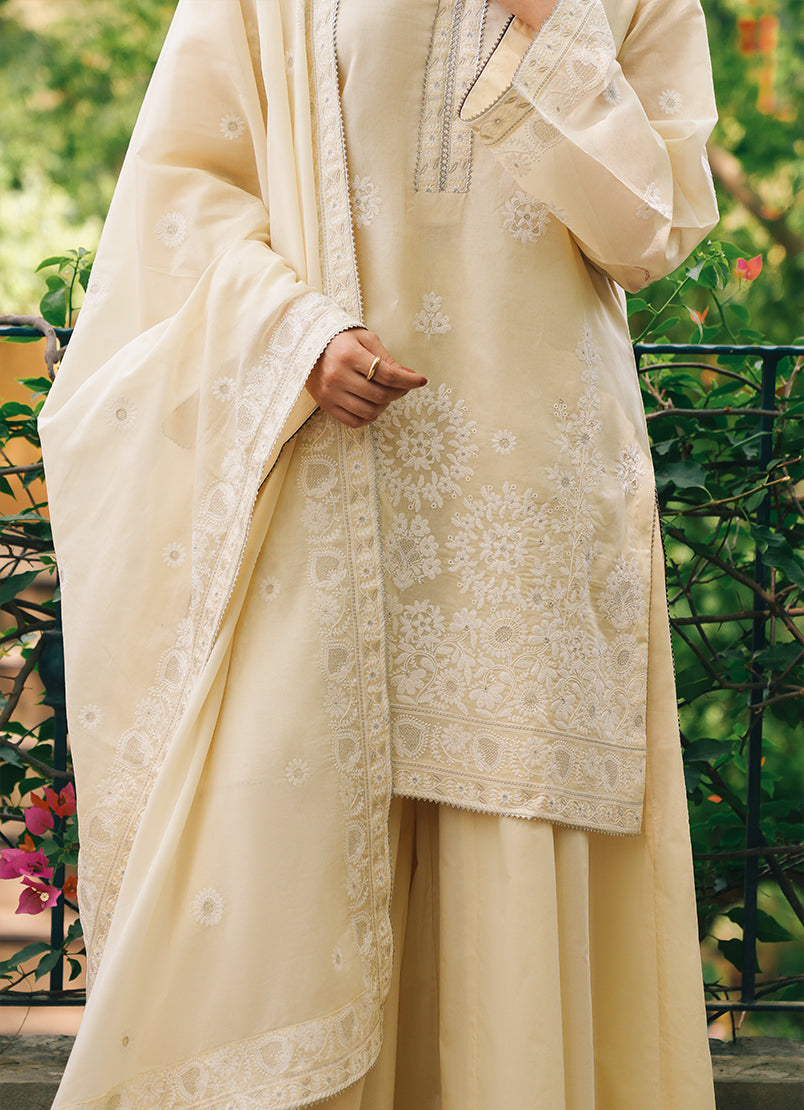 Ruhina in Kora from our Summerkari '25 Collection. An embroidered pure cotton voile 3-piece outfit paired with embroidered trousers & dupatta.