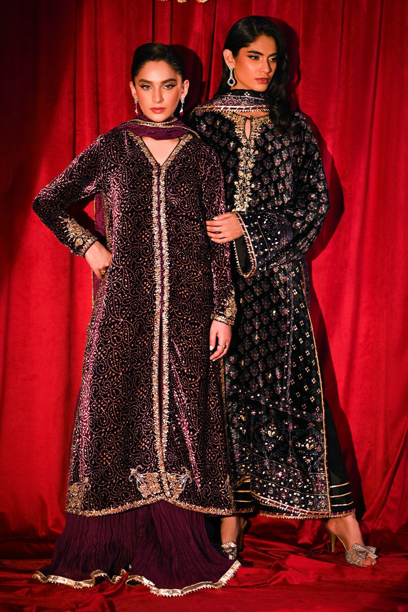This regal purple discharge front-open sherwani showcases intricate gota handwork that adds a touch of classic opulence. It is paired with a crushed Dhaka dupatta crafted from medium silk, featuring self block print and finished with delicate gota edging — creating a refined look that beautifully blends tradition and sophistication.