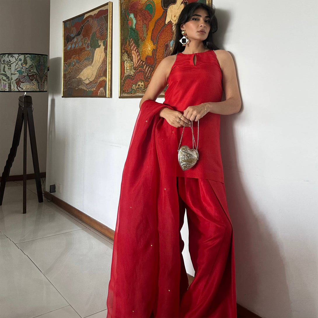 A Earthy and striking, this rust red outfit features a sleeveless top with a keyhole neckline paired with a dramatic farshi shalwar, the look merges traditional volume with contemporary simplicity.