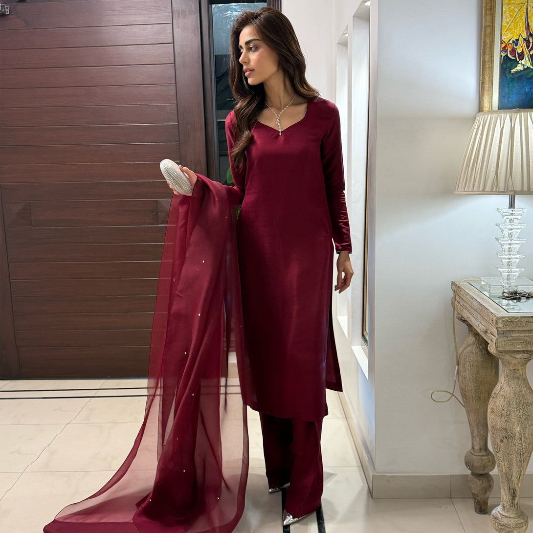 Rich magenta raw silk brings classic elegance to this ensemble with its deep hue and structured silhouette. The pure raw silk shirt and shalwar offer timeless sophistication, while the matching organza dupatta with delicate stud detailing adds a subtle touch of glamour. Ideal for formal events and festive gatherings where you want to make an impression with refined grace.