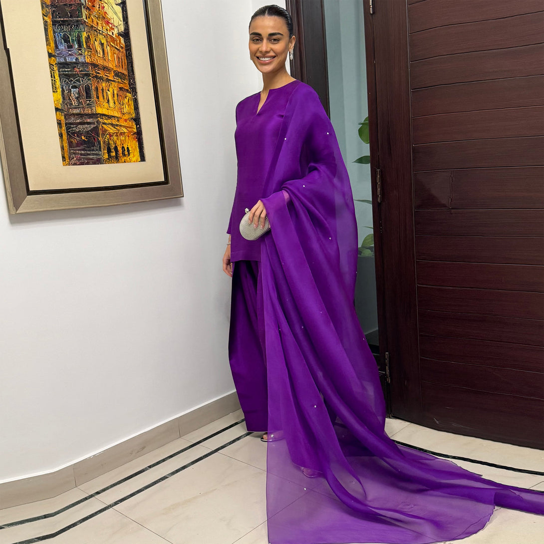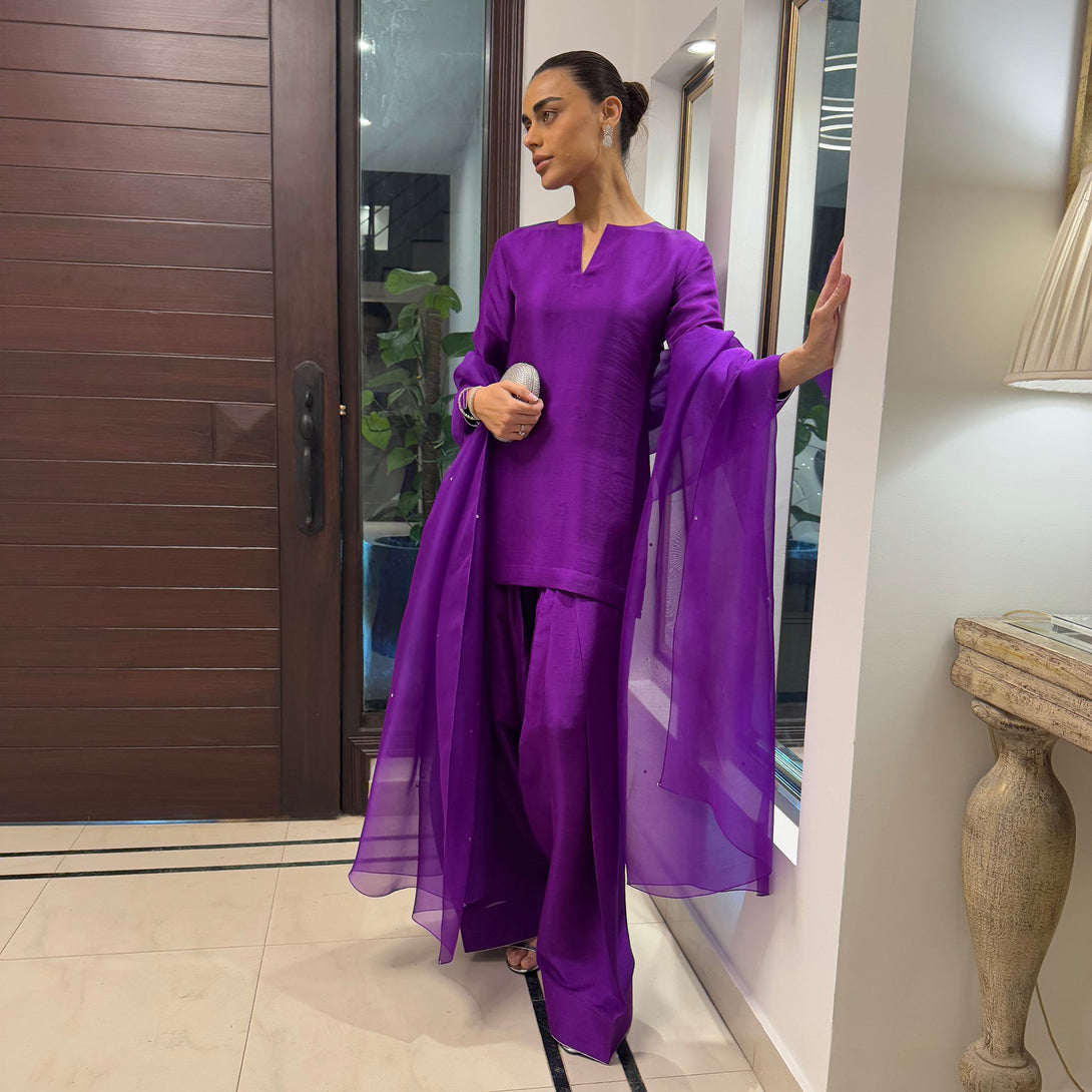 This elegant outfit features a rich purple Farshi Shalwar Kameez, tailored with traditional flair and timeless grace. The pure raw silk shirt and trousers create a regal silhouette, while the simple organza dupatta adds a touch of delicate charm and lightness to the overall look. A perfect choice for those who appreciate heritage styling with modern refinement.