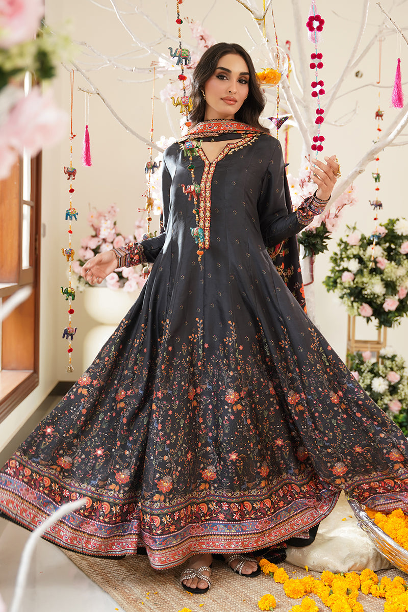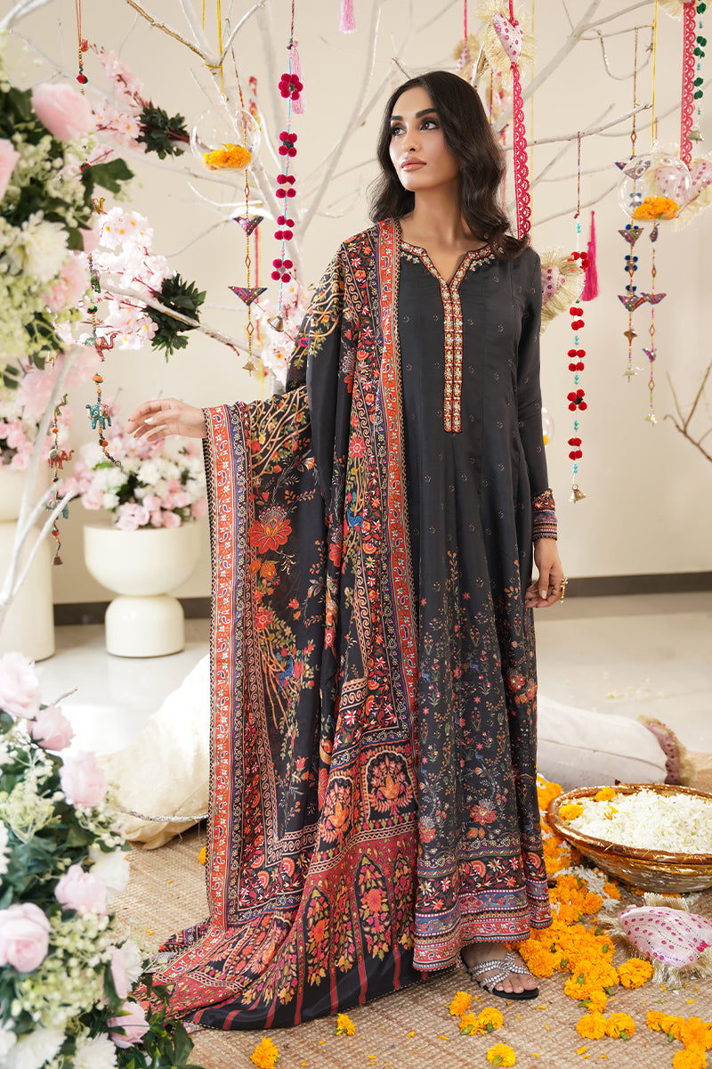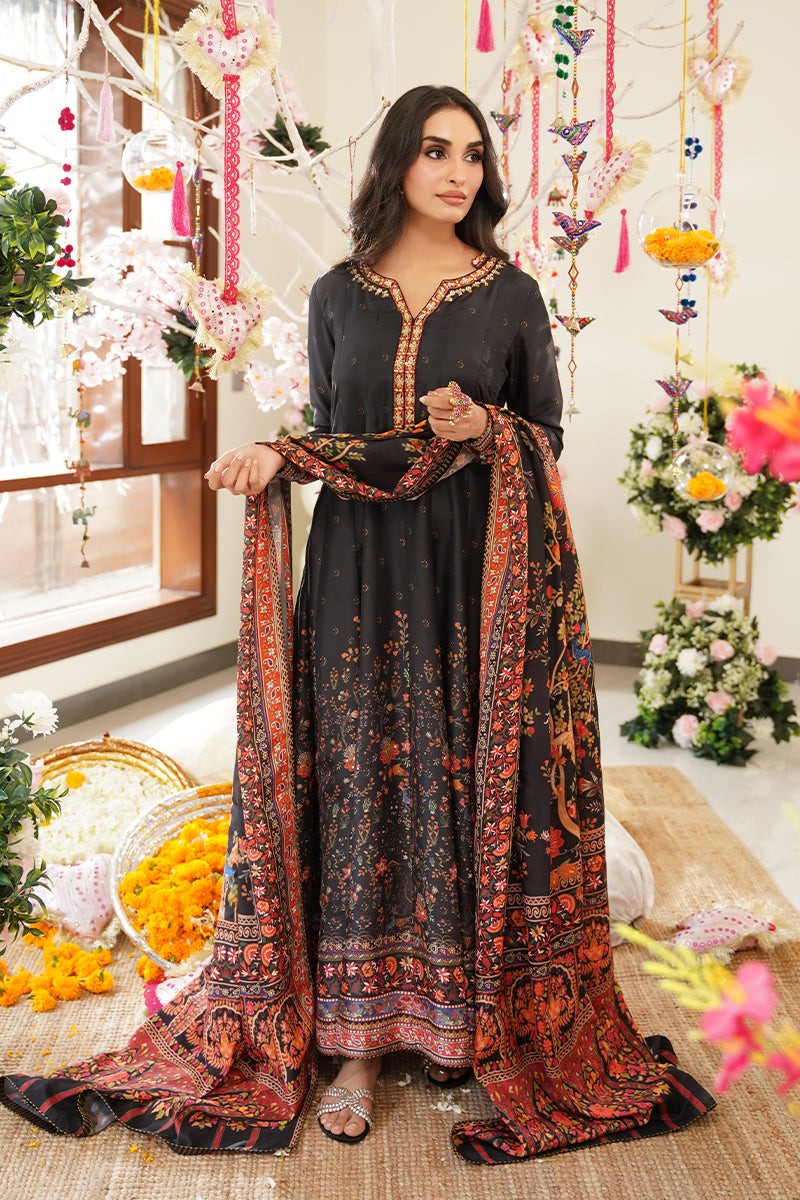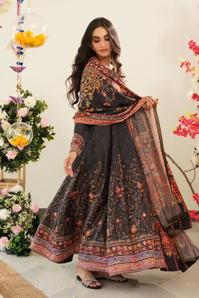 Bold and timeless, this black pure raw silk ensemble features vibrant floral prints in striking shades of red, orange, and green — creating a captivating contrast against the rich base. The neckline is delicately adorned with intricate handwork embellishments, adding a refined touch of craftsmanship and elegance. It is paired with a digitally printed crepe silk dupatta, featuring coordinated floral motifs and finished with self piping for a clean, tailored look.