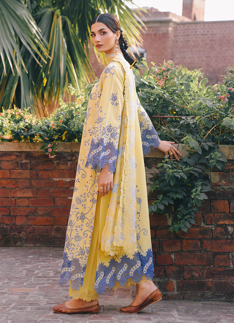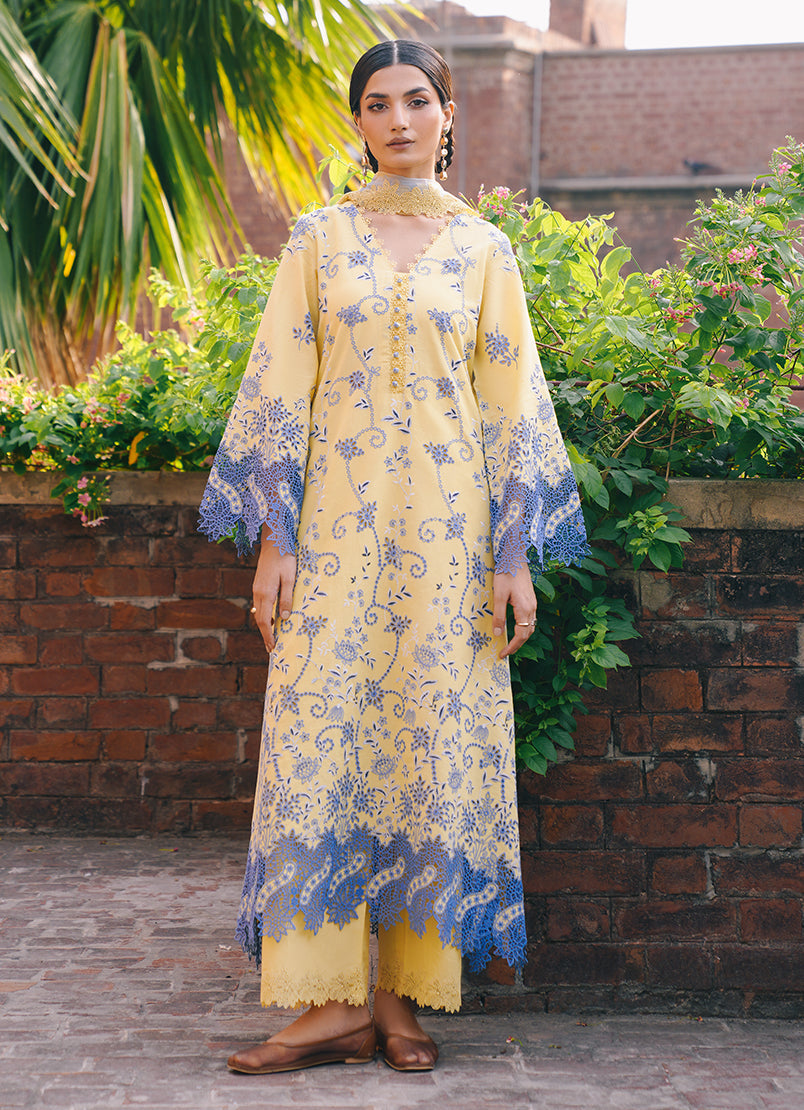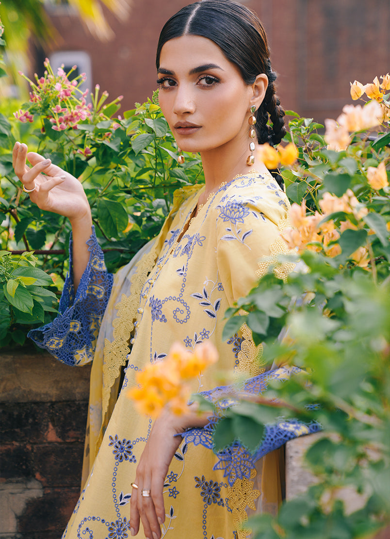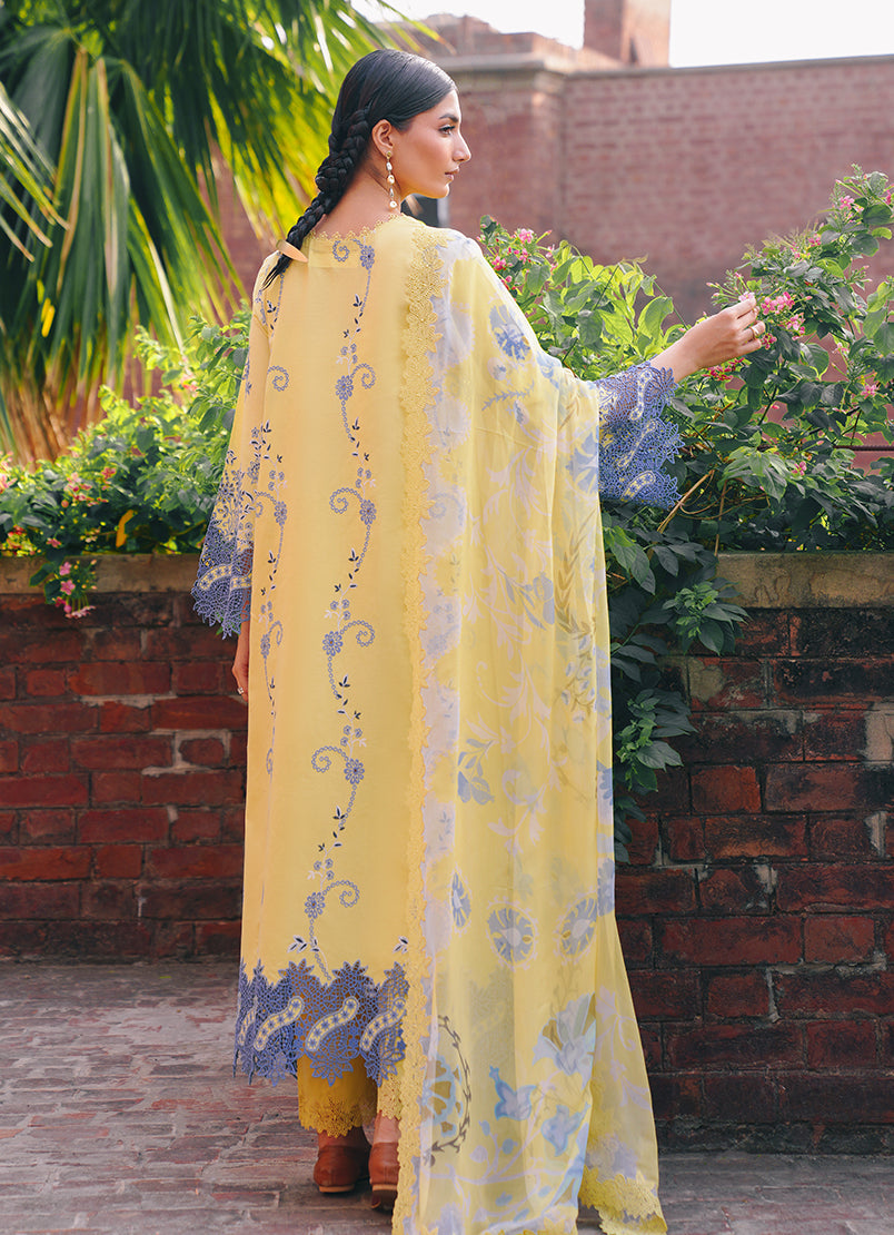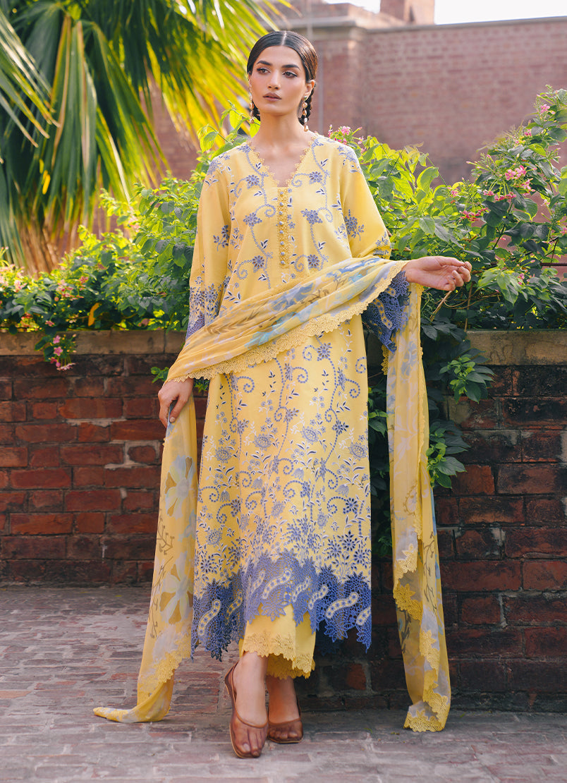 Sanae in Yellow from our Summerkari '25 Collection. An embroidered cotton lawn 3-piece outfit paired with cotton cambric trousers & digital printed chiffon dupatta.
