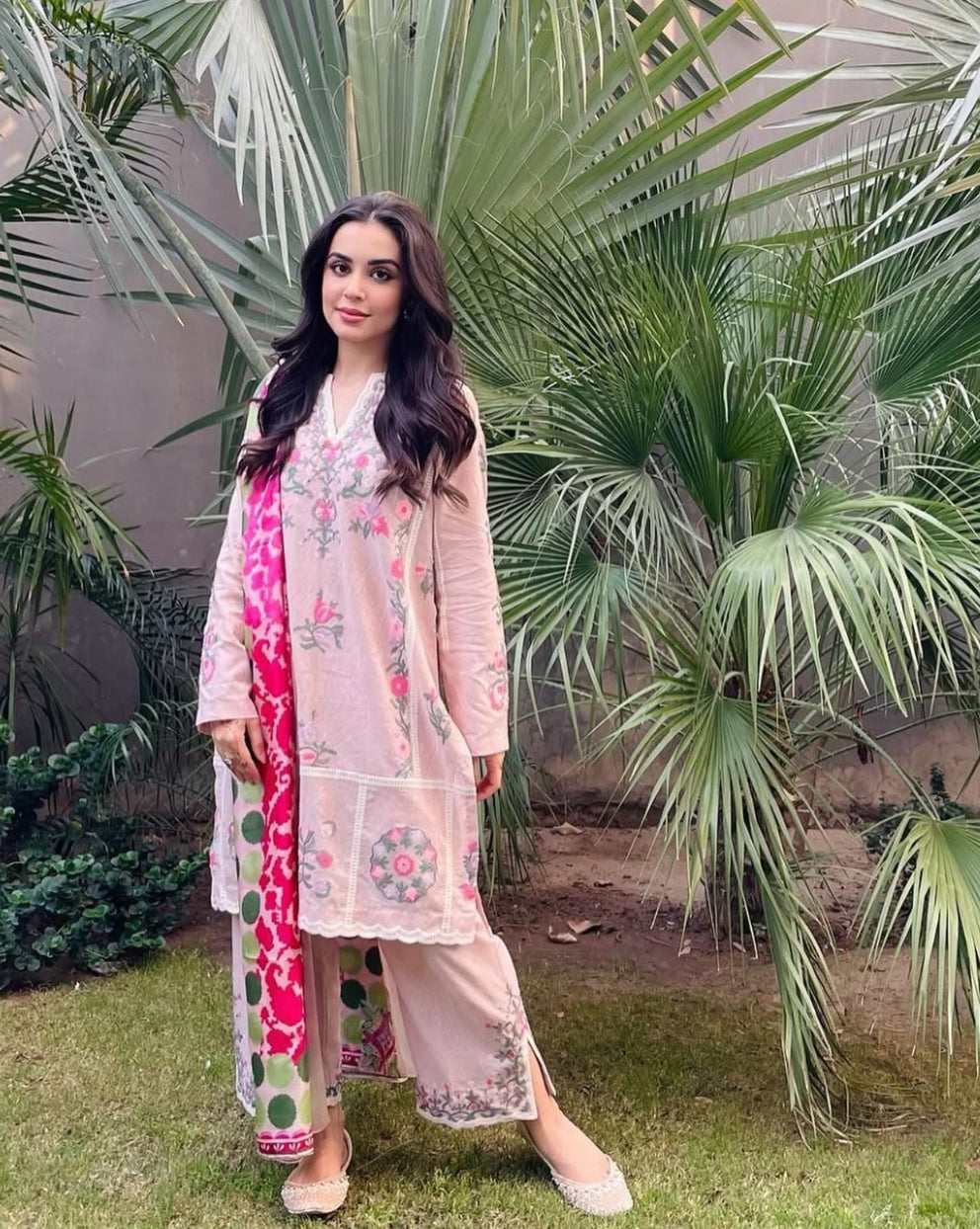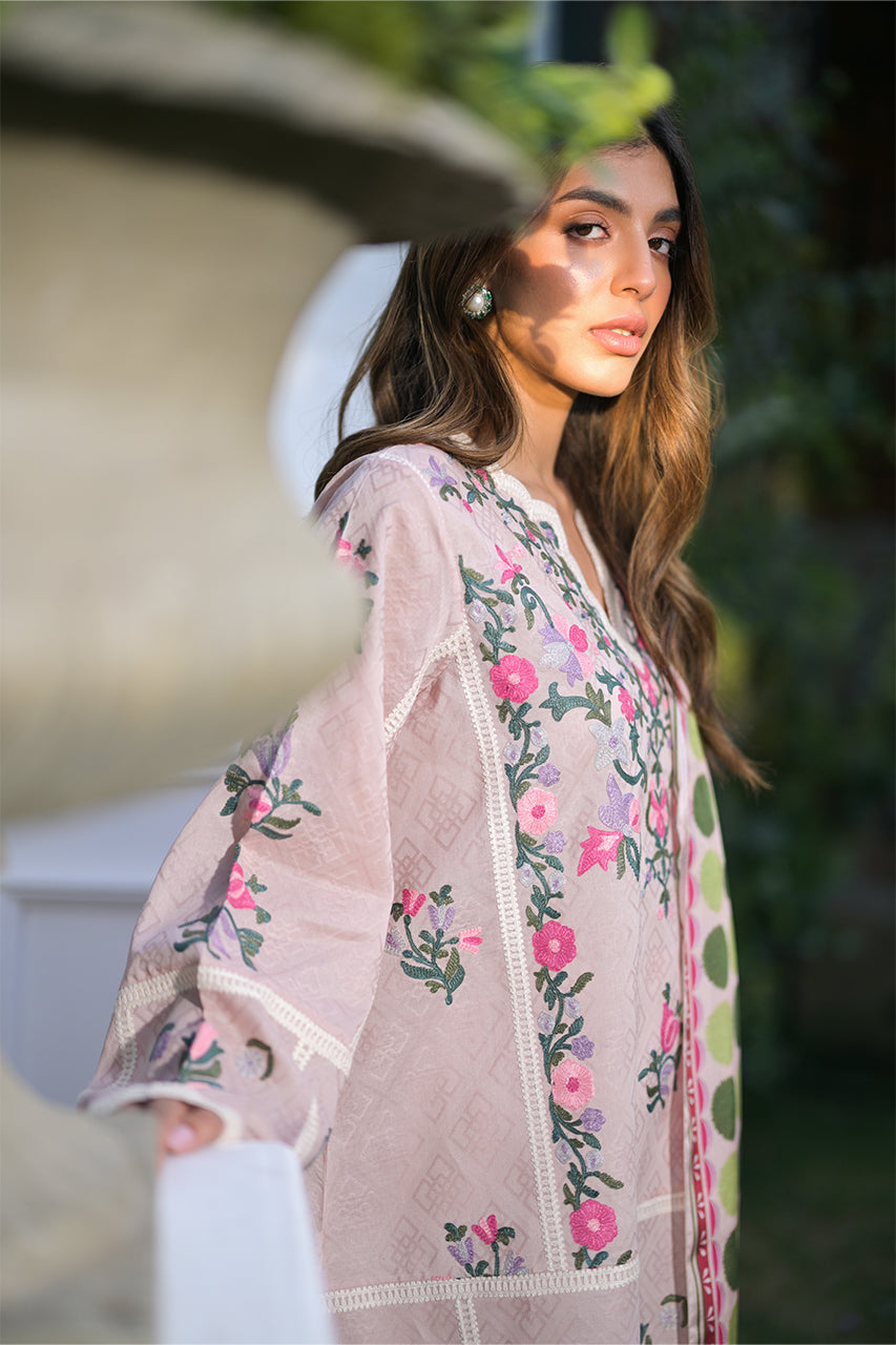A blush tinted jacquard lawn kurta is artfully rendered with floral aari embroidery in shades of forest green, pink, and cream with scallop details. Paired with matching jacquard culottes with embroidered details. A bright pink medium silk printed dupatta framed with playful polka dots completes the look.