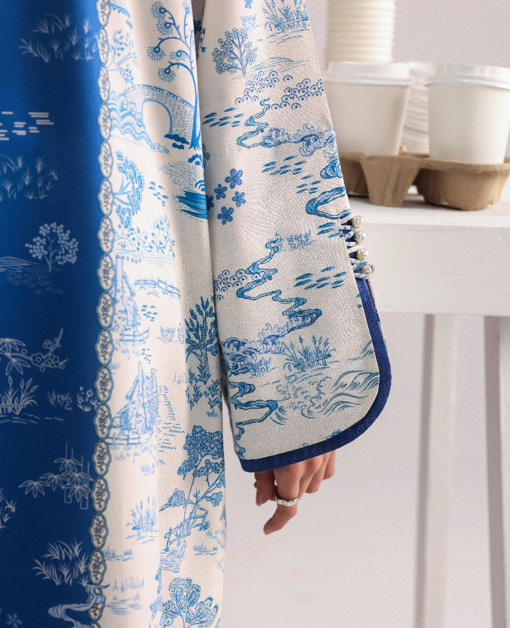 In a mixes of blue and white tones design blend with scenic and floral pattern, creating a modern yet classic look inspired by oriental and porcelain pattern paired with crisp white trouser for the fresh sharp vibe.