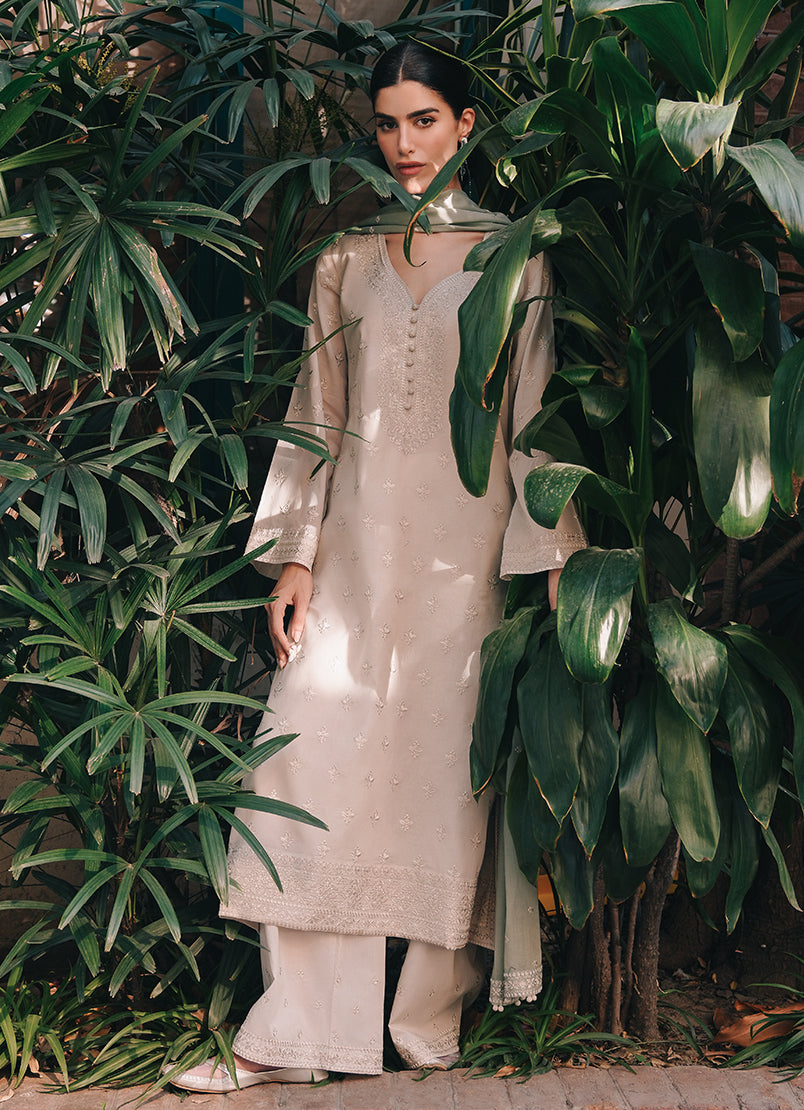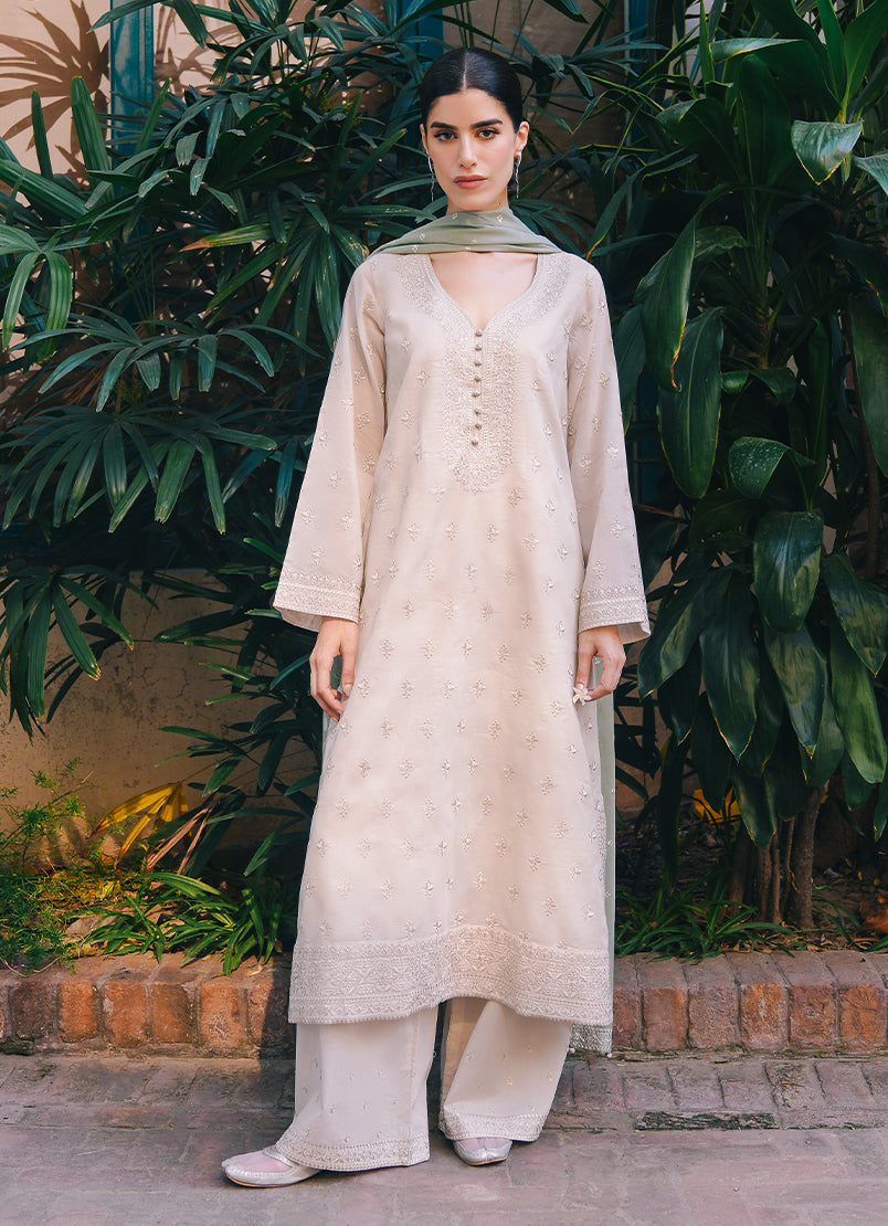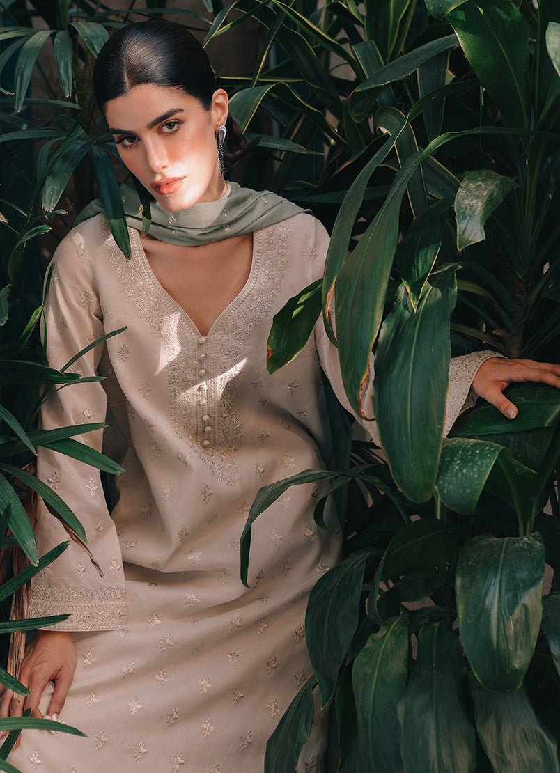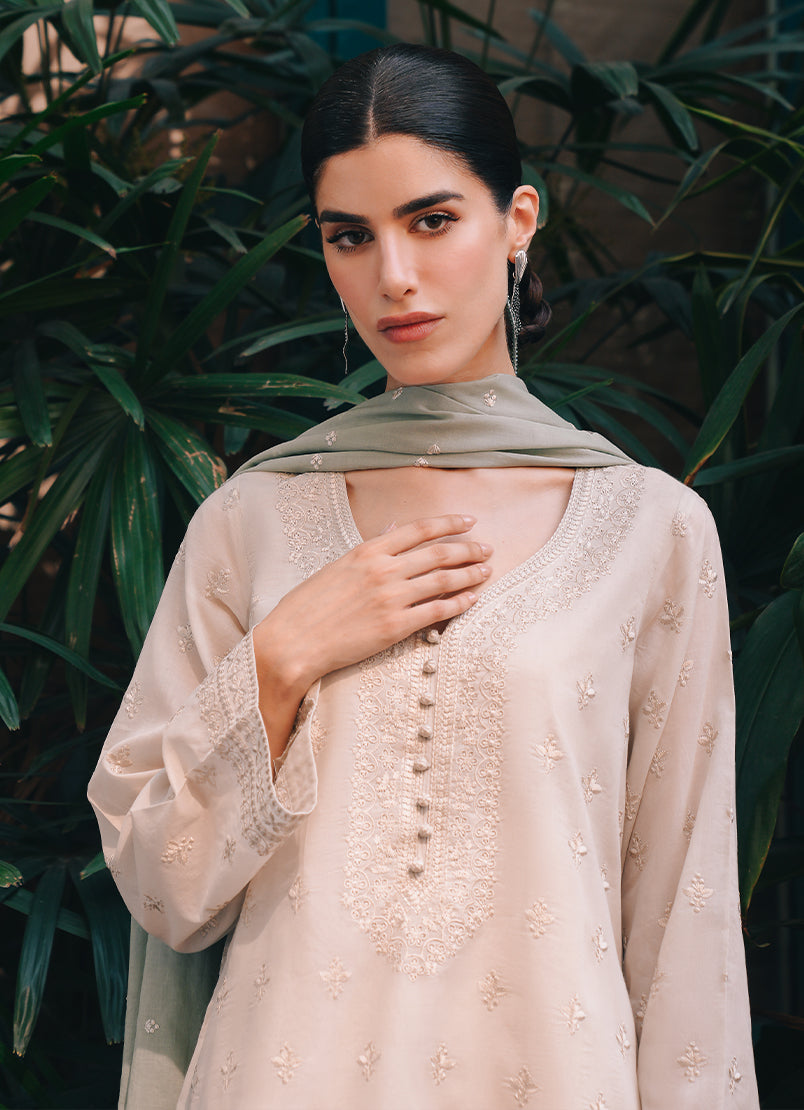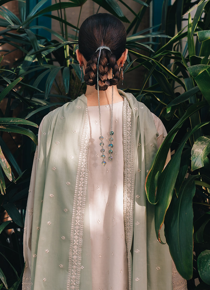 Selma in Sage Green/Olive Green from our Summerkari '25 Collection. An embroidered pure cotton voile 3-piece outfit paired with embroidered trousers & dupatta.
