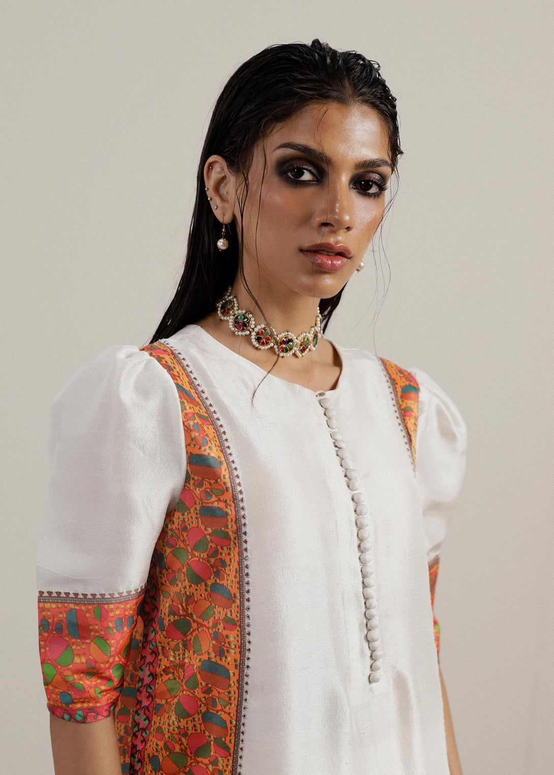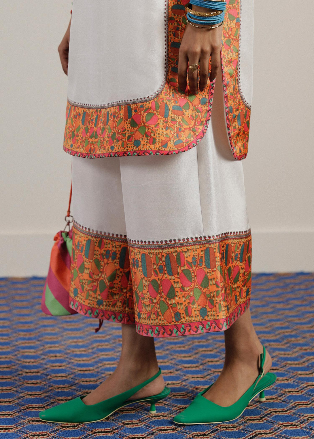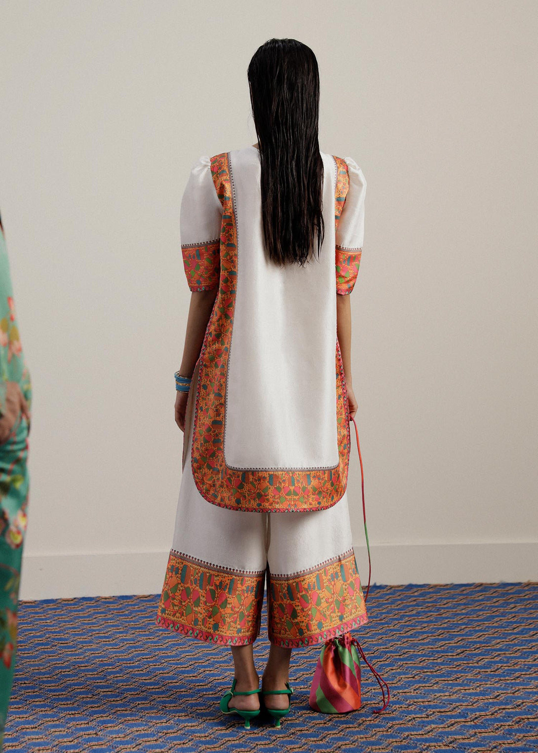 An outstanding set including an ivory raw silk shirt with printed orange borders aligned all of the way down to hem of the shirt and sleeves. The neckline has classic loop buttons descending down to the middle of the shirt. It is further paired with ivory raw silk culottes with similarly printed borders on the hem.