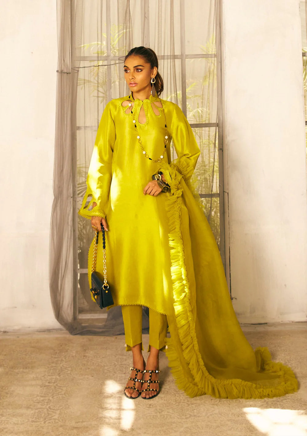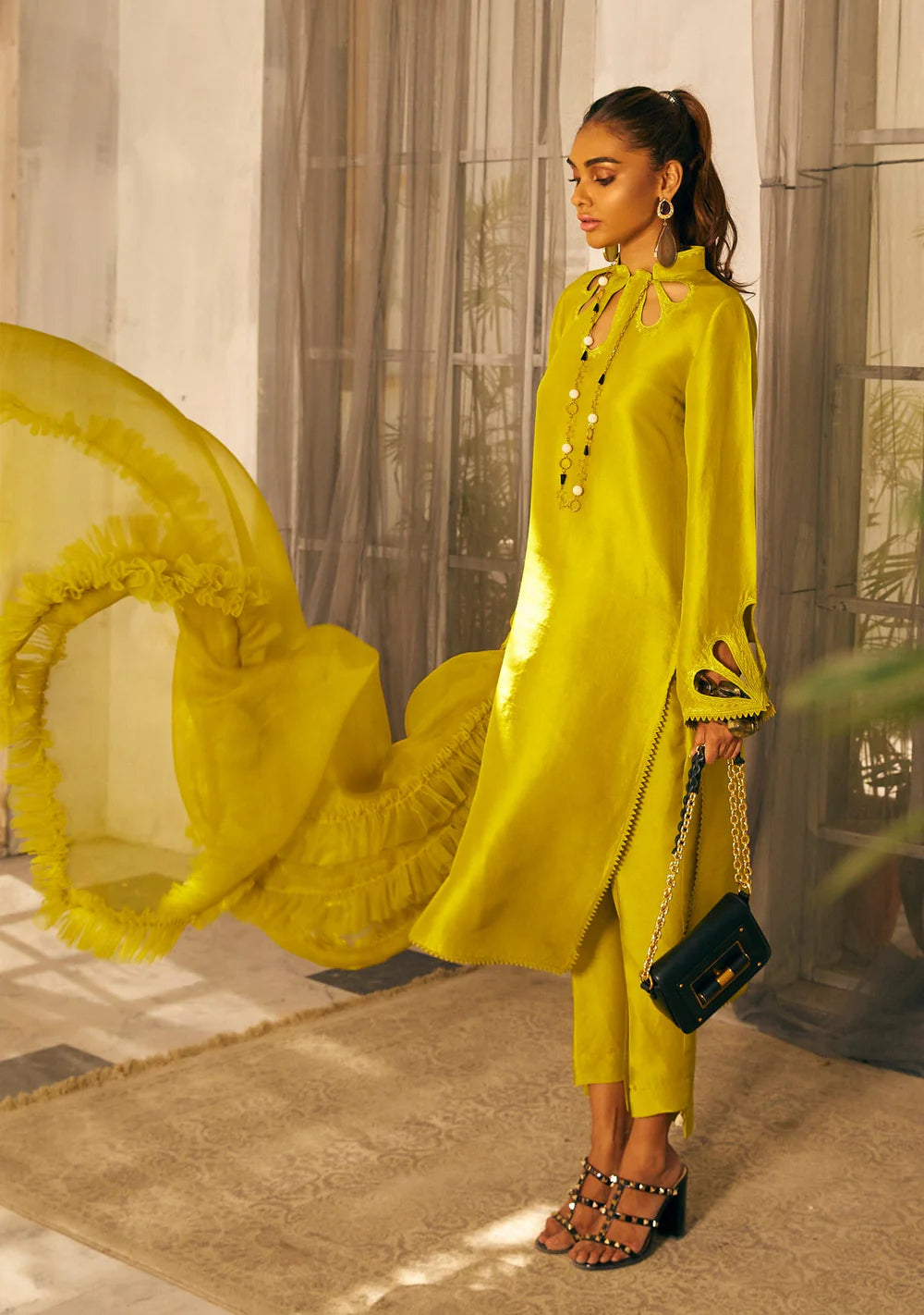 Seriyah, the chartreuse green gem comes with statement cutouts around the neckline and sleeves highlighted with intricate embroideries. The high-low pencil pants have an accent of off-white tassels on the edges and come with an organza dupatta with frilly edges. The pants have a slit in the back with tassel accents. The shirt is made in pure 80 gram raw silk, the pants are made in pure 60 gram raw silk and the dupatta is made in pure organza.