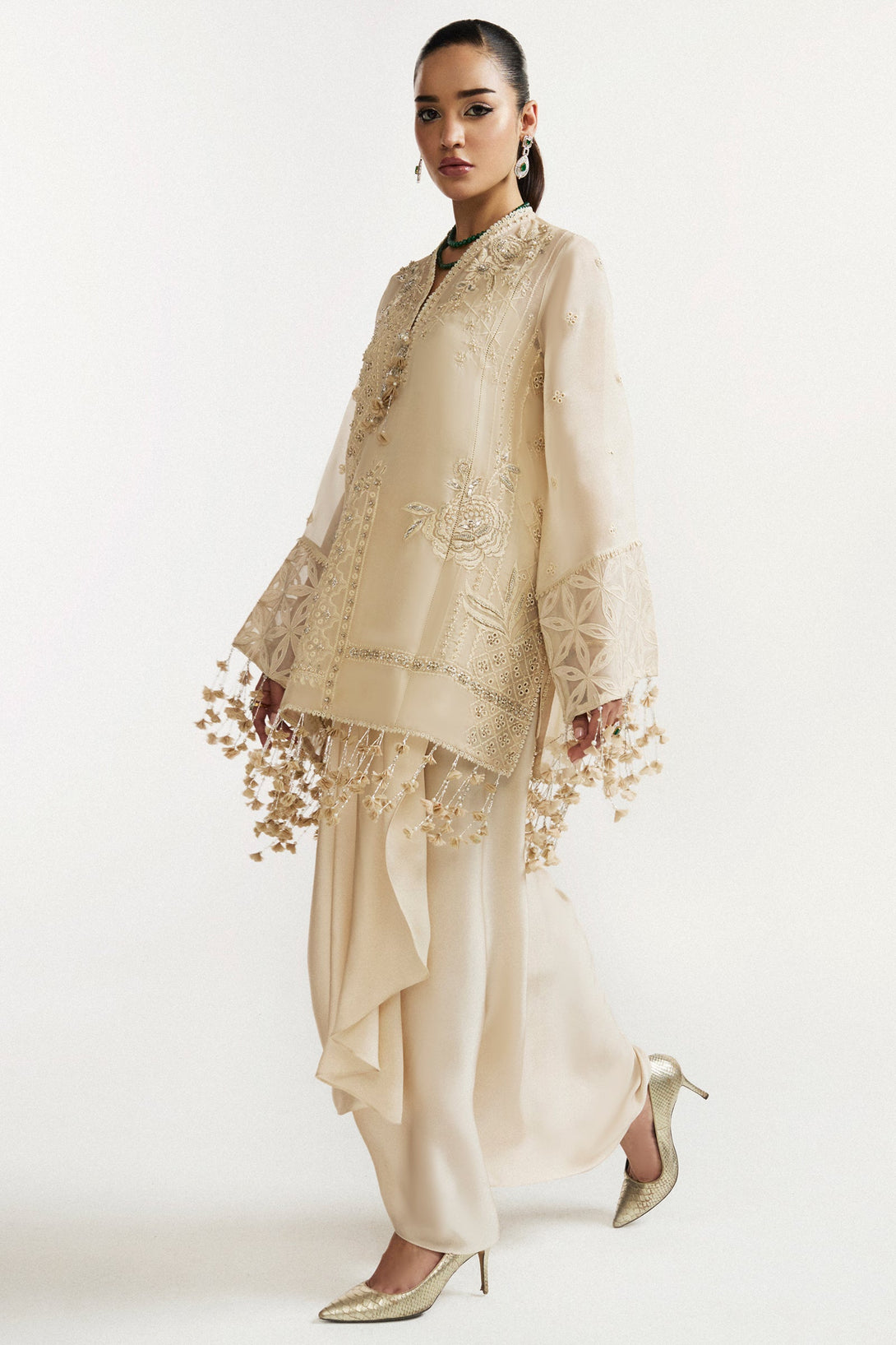 Drenched in the effervescent glow of champagne, Solenne d'Or is a vision of rhythmic elegance and gilded allure. The sheer organza shirt, embroidered with an intricate play of florals and geometric artistry, shimmers with a quiet opulence, while the billowing sleeves, adorned with exquisite cutwork and cascading bead embellishments, sway with every movement—grace in motion.