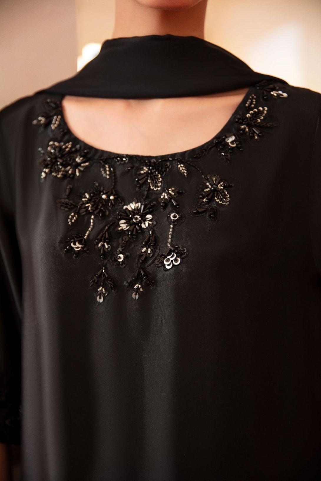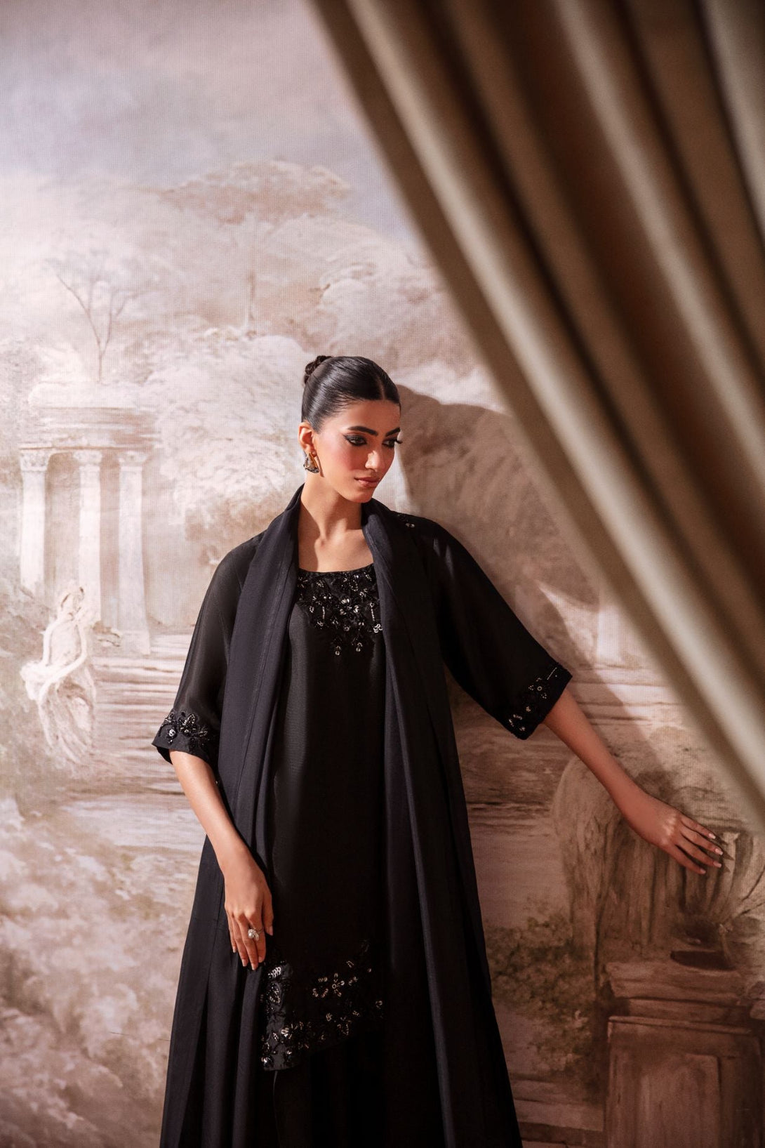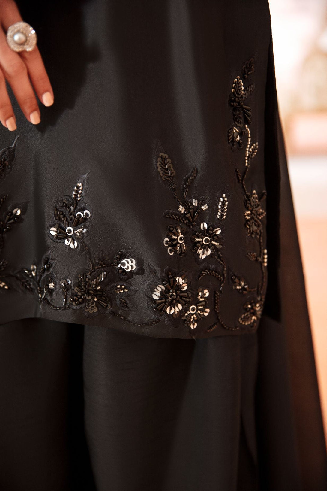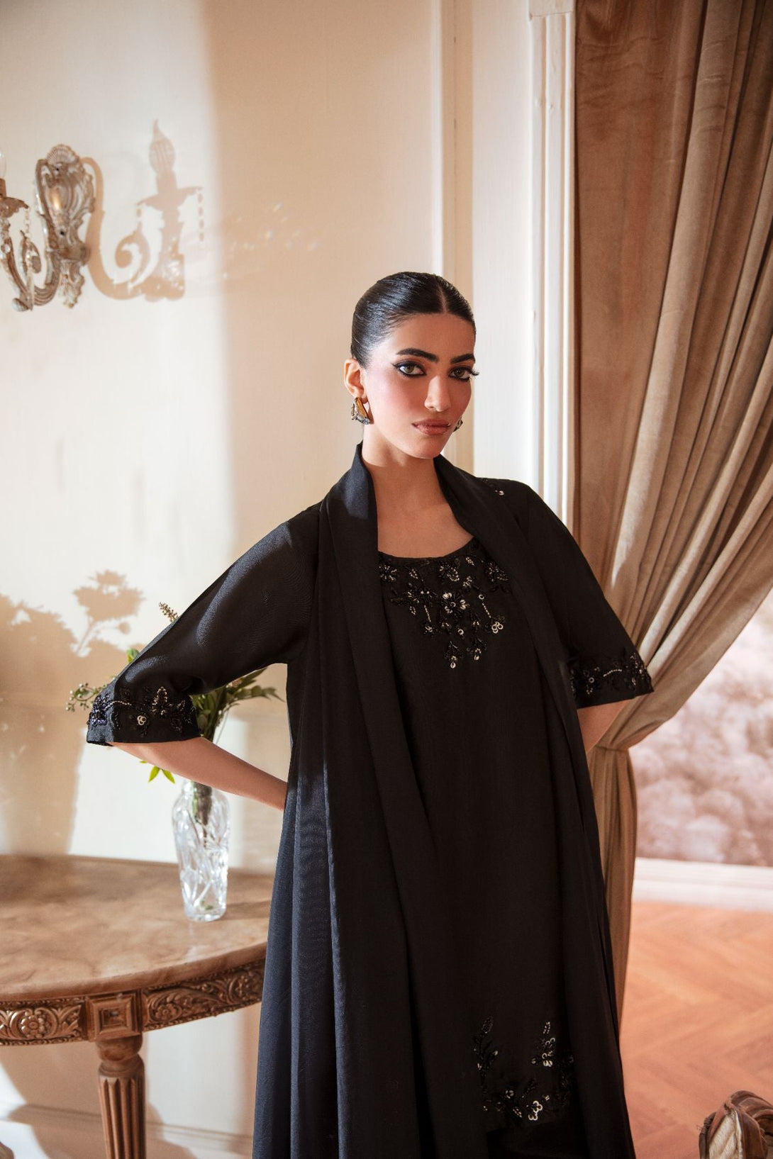 A 3pc set on sheesha Silk, embellished in monotones, it comes with a medium silk duppata and a farshi shalwar.