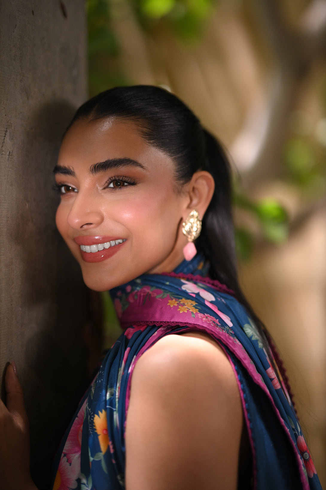 This captivating teal blue article features a beautifully embroidered full-length shirt, designed with a light and airy summer aesthetic in refreshing green and pink tones. Complementing this elegant shirt is a luxurious floral printed silk dupatta, delicately finished with a lace trim, and stylishly embroidered izaar trousers, creating a harmonious and sophisticated ensemble perfect for the warmer months.