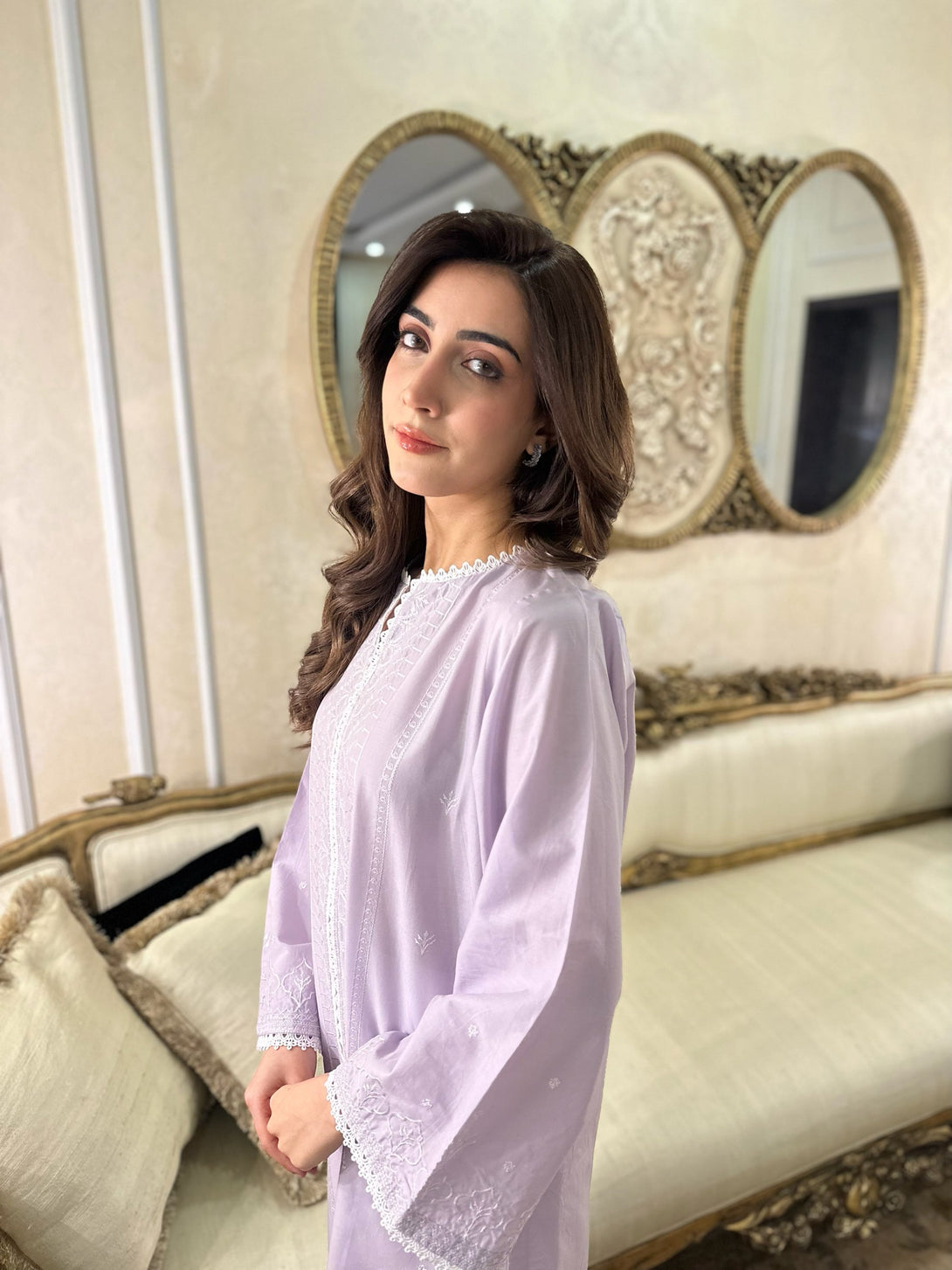 This long pale lilac kurta is crafted with a lustrous finish. The kurta is adorned with specific floral embroidered boxes on the neckline, sleeves and unique lace work. An exquisite piece is to refresh your wardrobe.