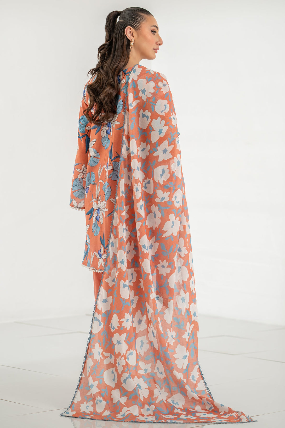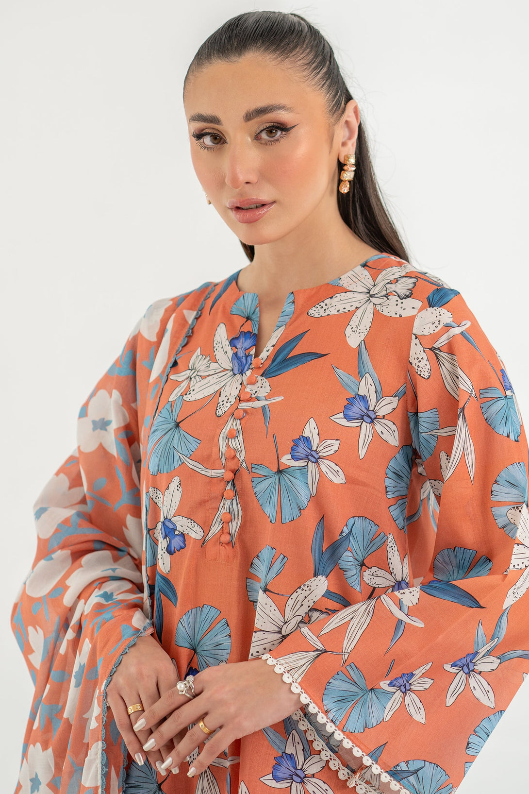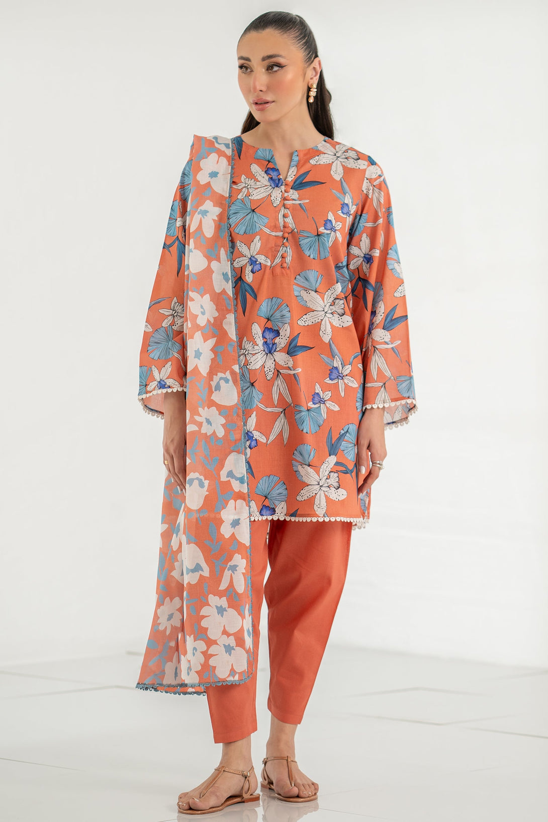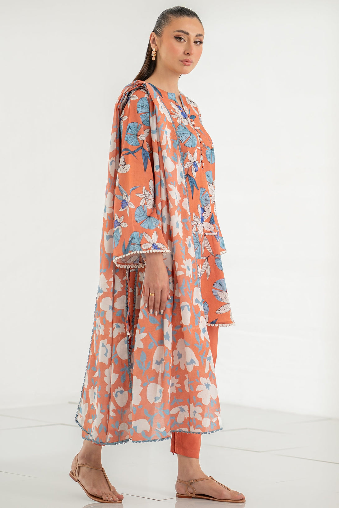 This peach colored beautiful digital print three-piece is perfect for this summer