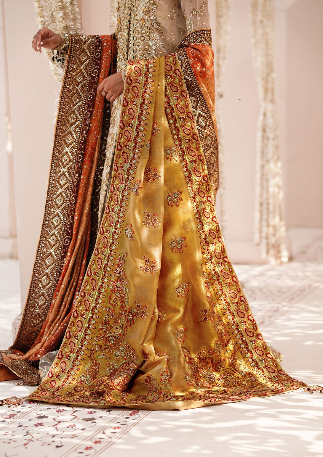 - This Indian gold shawl, crafted from traditional gold tissue, boasts a stunning multi-toned embroidered design. The heavily embroidered pallus add depth and elegance, while iconic paisley motifs repeat throughout, bringing a timeless charm to this luxurious piece.