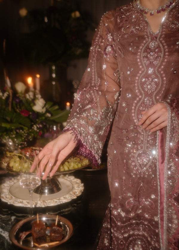 Upcoming seasons trending color come to life in an elegant 3 panel shirt with a contrasting deeper trouser giving the outfit an ombré effect . Accented by detailing in silver work with crystals and pearls , this designs has a sophisticated modern appeal. Dupatta is crafted on organza with hints of beautiful sage green thread lifting the purple hues along a scalloped border and denser palus.