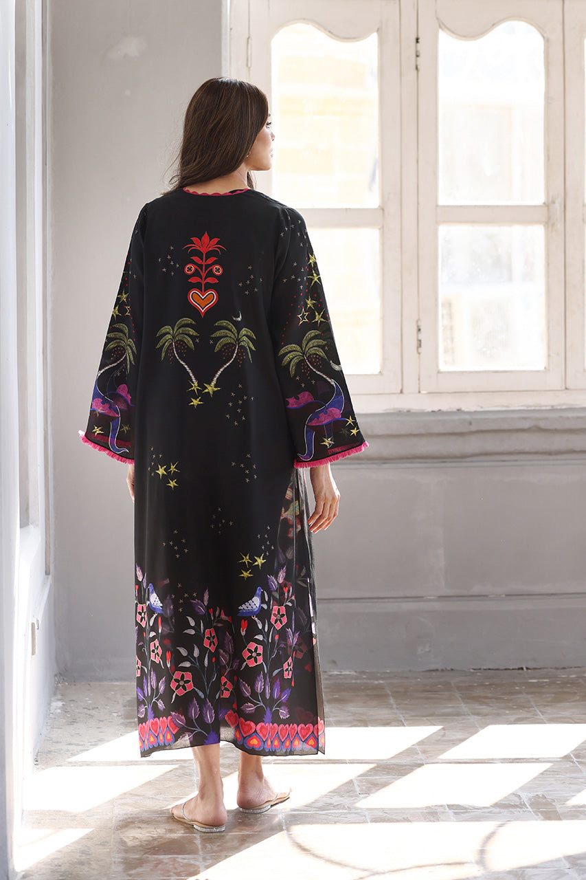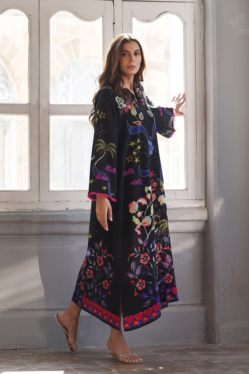 A playful ebony crepe kaftan showcases a whimsical multi-hued print with floral and heart patterns. The relaxed silhouette is adorned with scarlet detailing the sleeves.