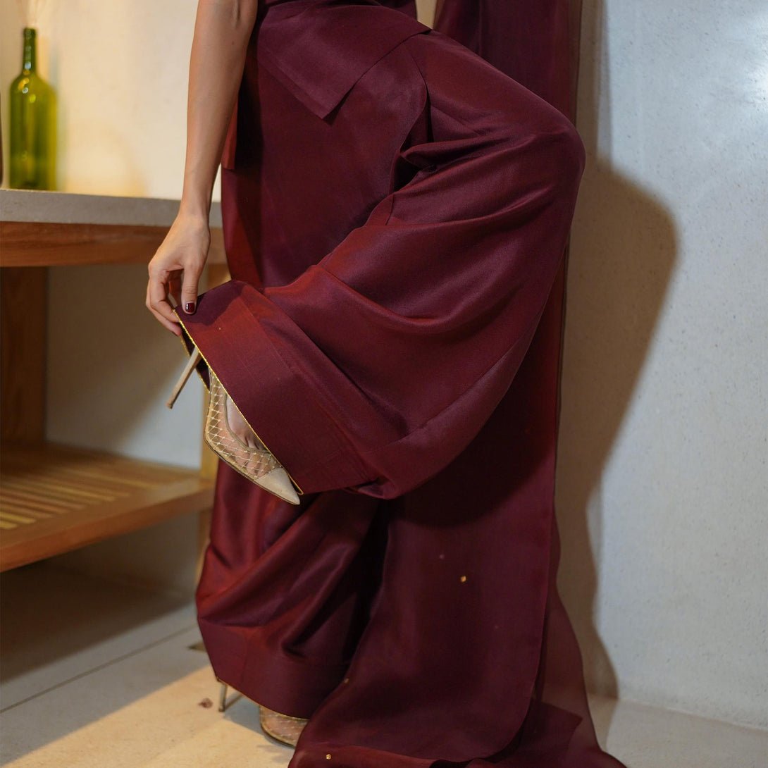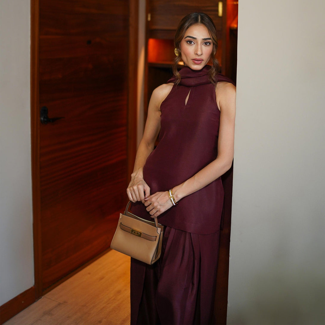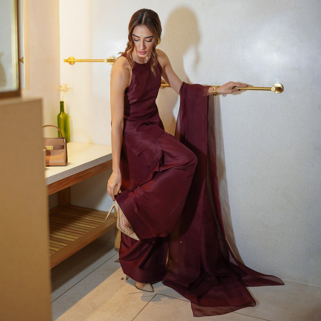 This burgundy raw silk ensemble exudes quiet confidence and timeless allure. The rich tone and structured silhouette in pure raw silk offer depth and poise, while the weightless organza dupatta adds a whisper of elegance. Effortlessly graceful, it’s perfect for evenings where presence speaks louder than sparkle.
