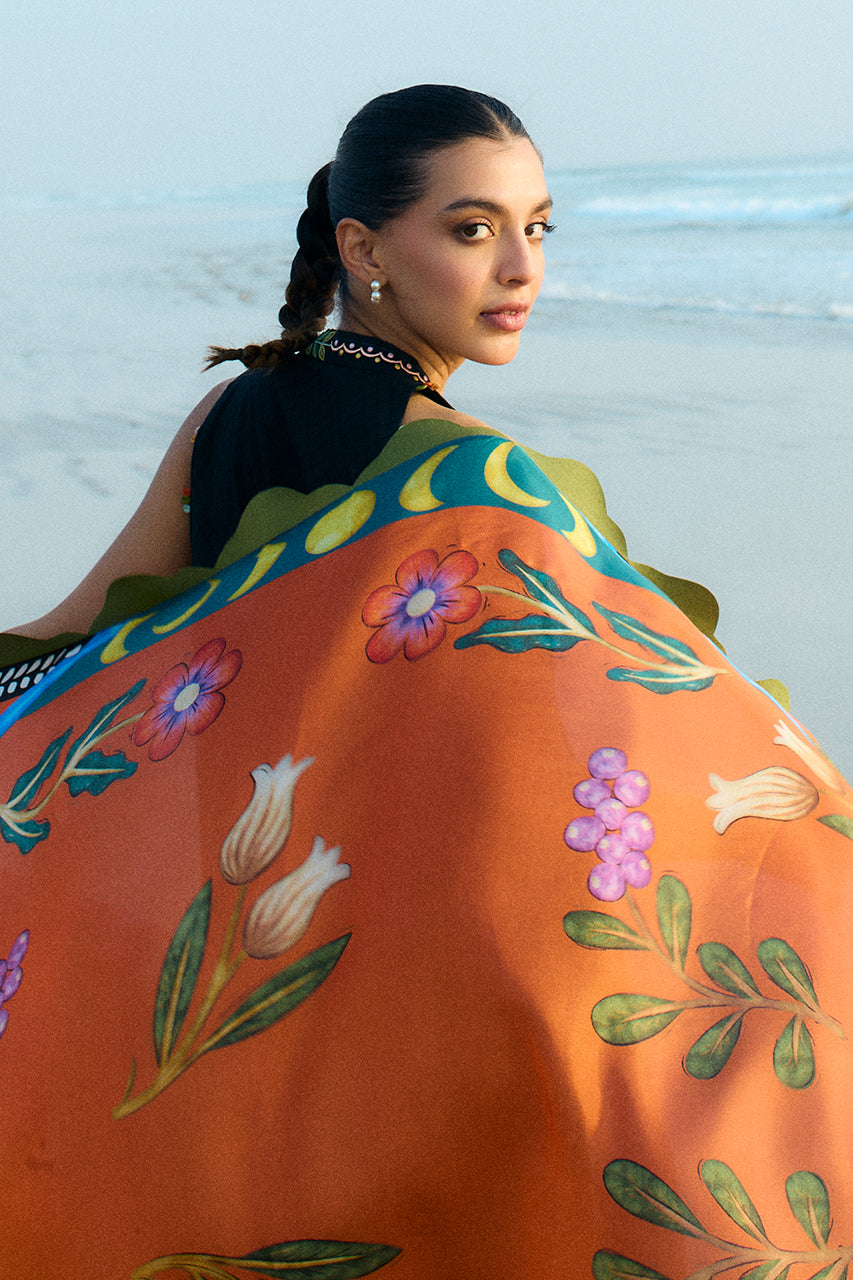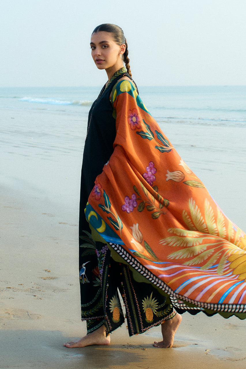 A tropical dream comes to life on an ebony hued jacquard lawn shirt and culottes. Embroidered with nature's elements and playful flamingos, the set is balanced with intricately embroidered borders and lush green vines on the neckline and the hem of the culottes. Paired with a pure medium silk dupatta featuring a painterly floral print in hues of a stunning sunset.