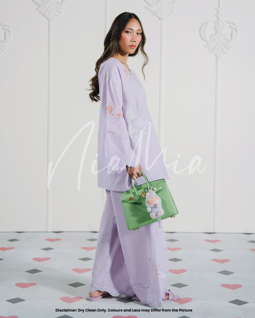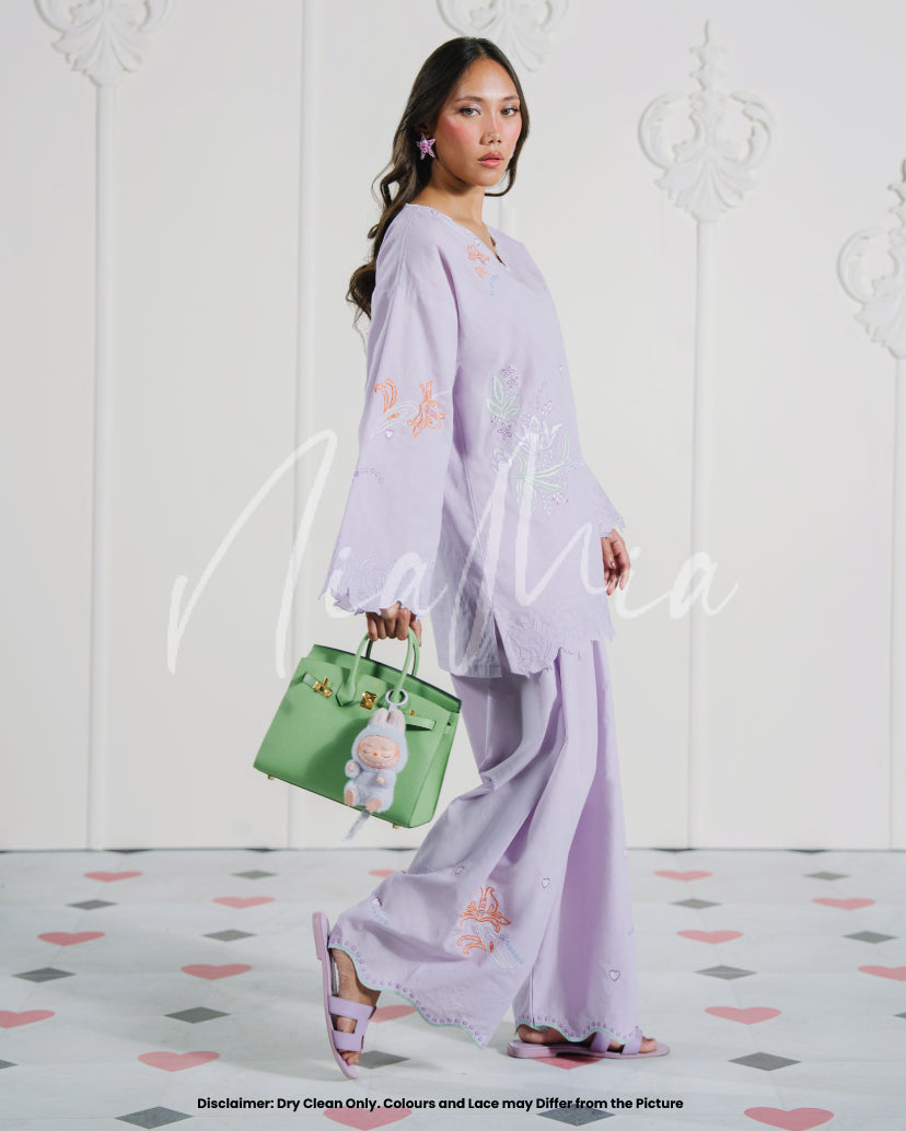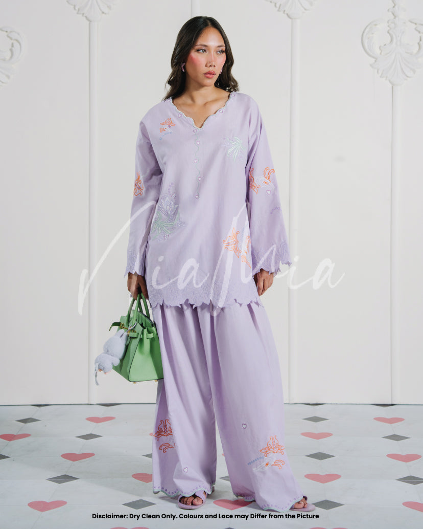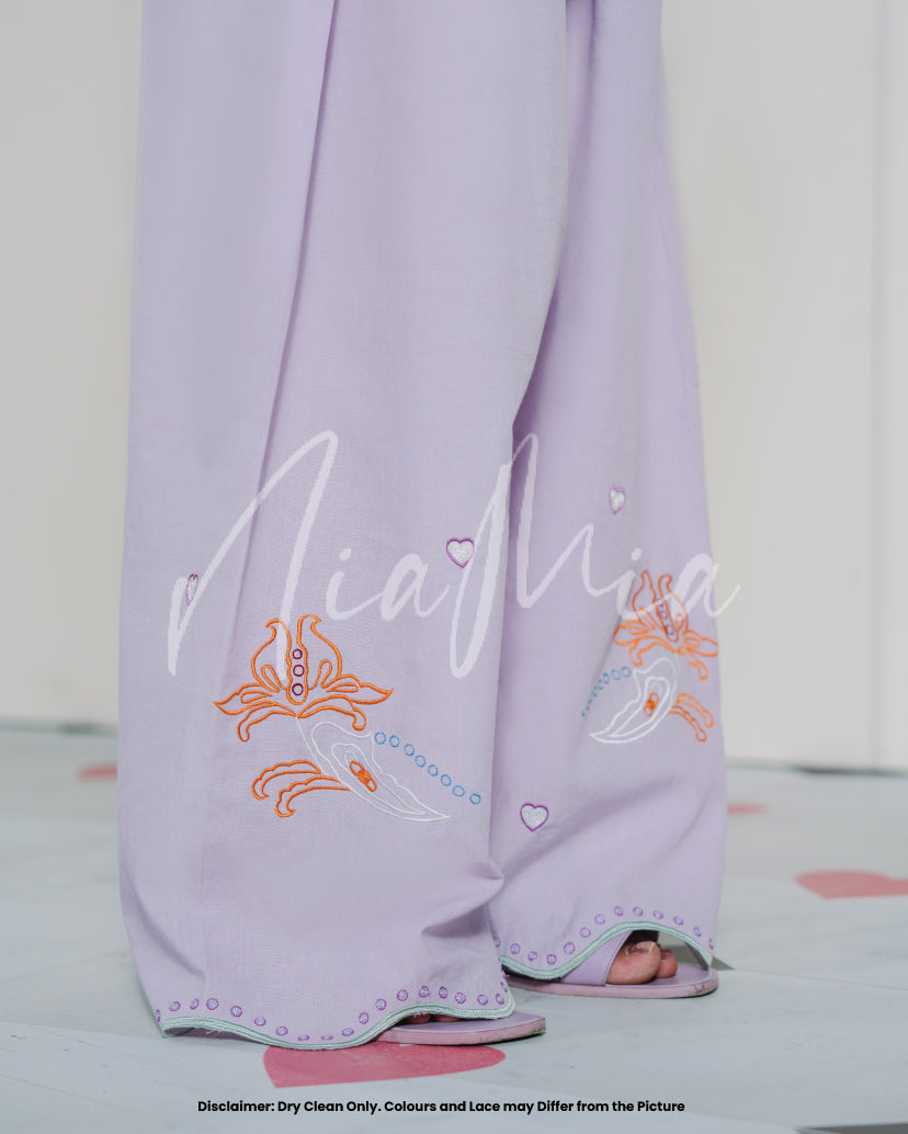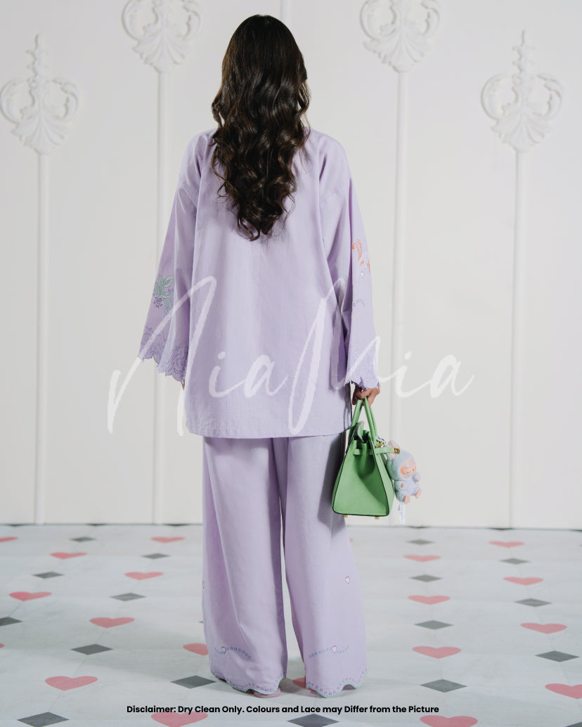 A soft lilac cotton lawn co-ord set featuring intricate pastel embroidery in shades of mint, coral, and white. The kurta is finished with delicate scalloped edges on the sleeves and hem.