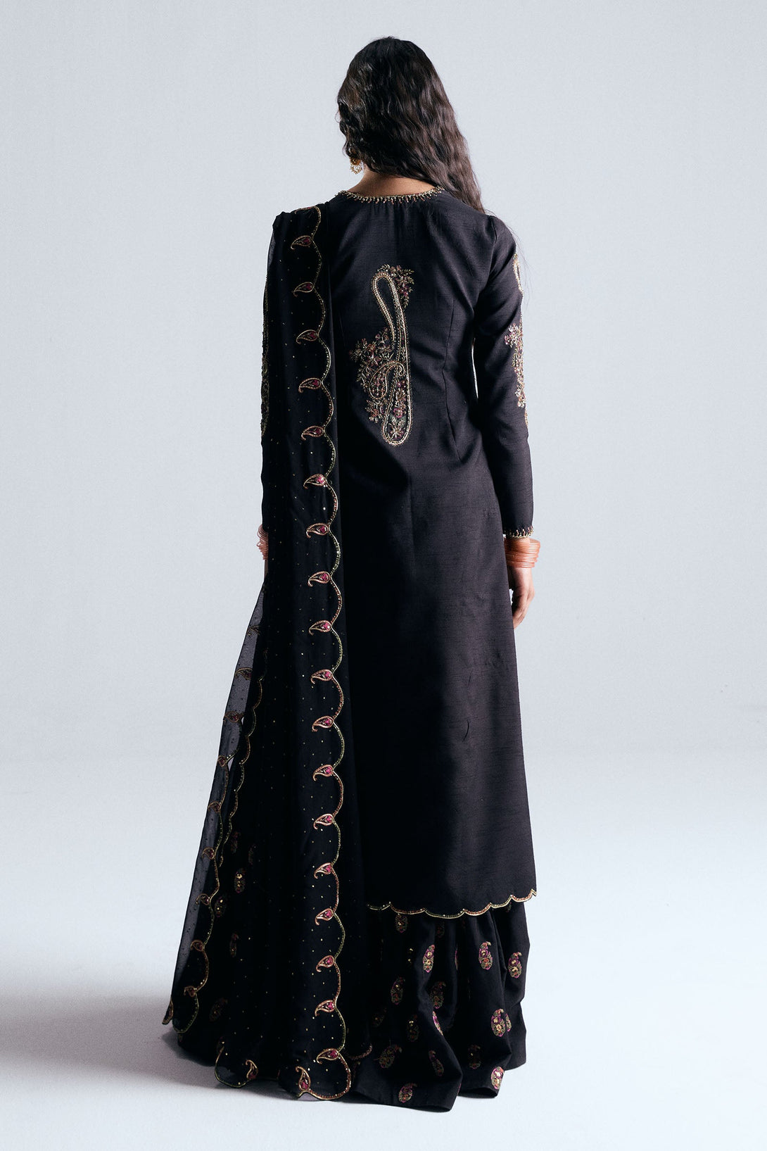 Lail is a classic black long shirt adorned with intricate paisley motifs, brought to life through delicate naqshi, dori, and sequin adda work. The silhouette is paired with a low gota gharara, detailed with paneled construction and ornate paisley embroidery along the flare. The ensemble is completed with a chiffon dupatta, featuring all-over sequin embellishment and finely scalloped border.