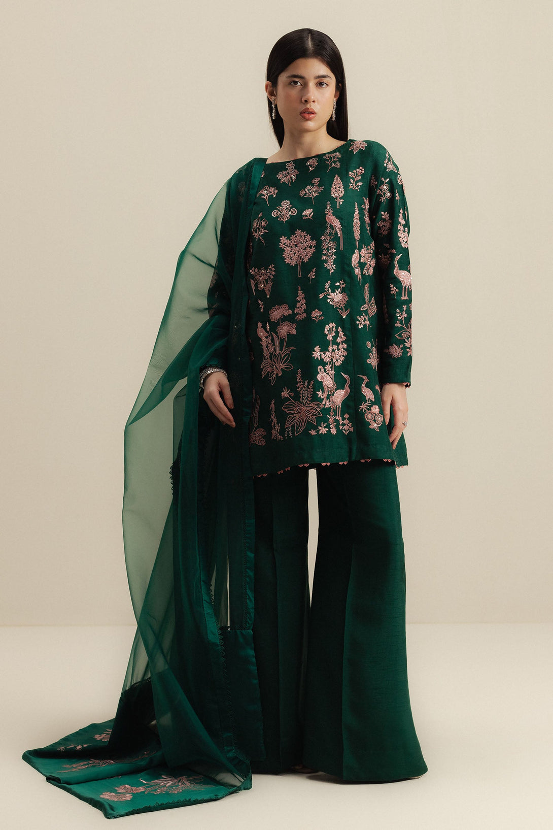 A forest green outfit crafted in medium raw silk, designed with fine embroidery and subtle details for an elegant, timeless look.